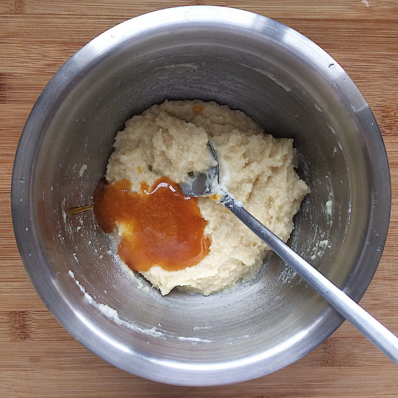 Добавляем миндальный экстракт (1 — 2 капли) и абрикосовый джем (3 ст.л.). Если он густой — подогрейте в микроволновке — тогда его можно будет с легкостью процедить через сито.