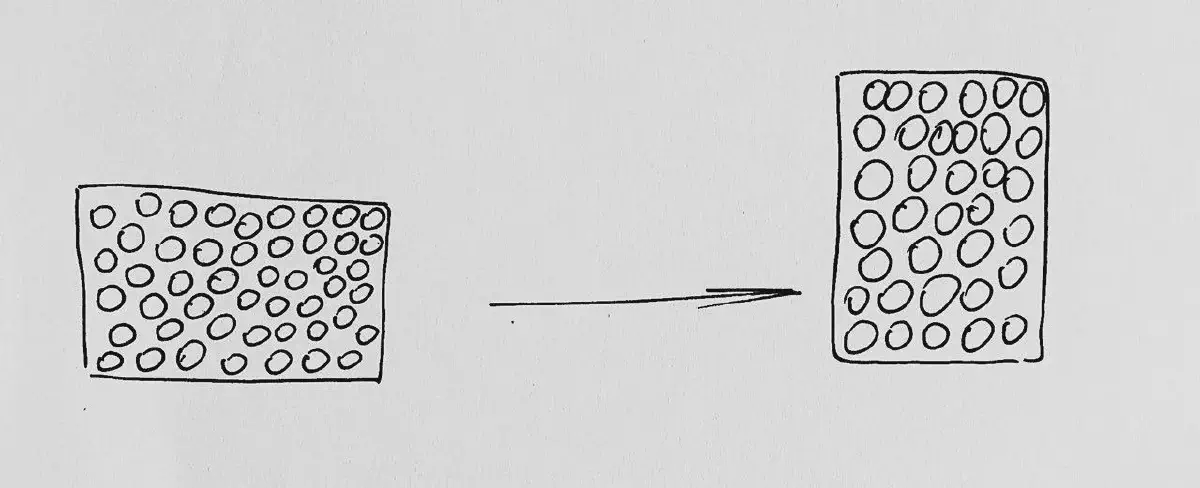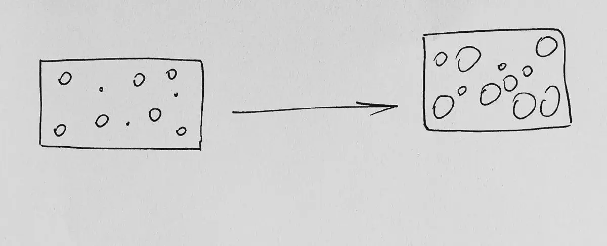 Во время замеса теста, смешивания ингредиентов, просеивания муки и т.д. мы так или иначе, насыщаем тесто пузырьками воздуха. В сыром тесте, они мелкие и не заметны глазу, но именно они формируют те самые «клетки», которые при выпечке наполняются паром, или углекислым газом, и расширяются.
