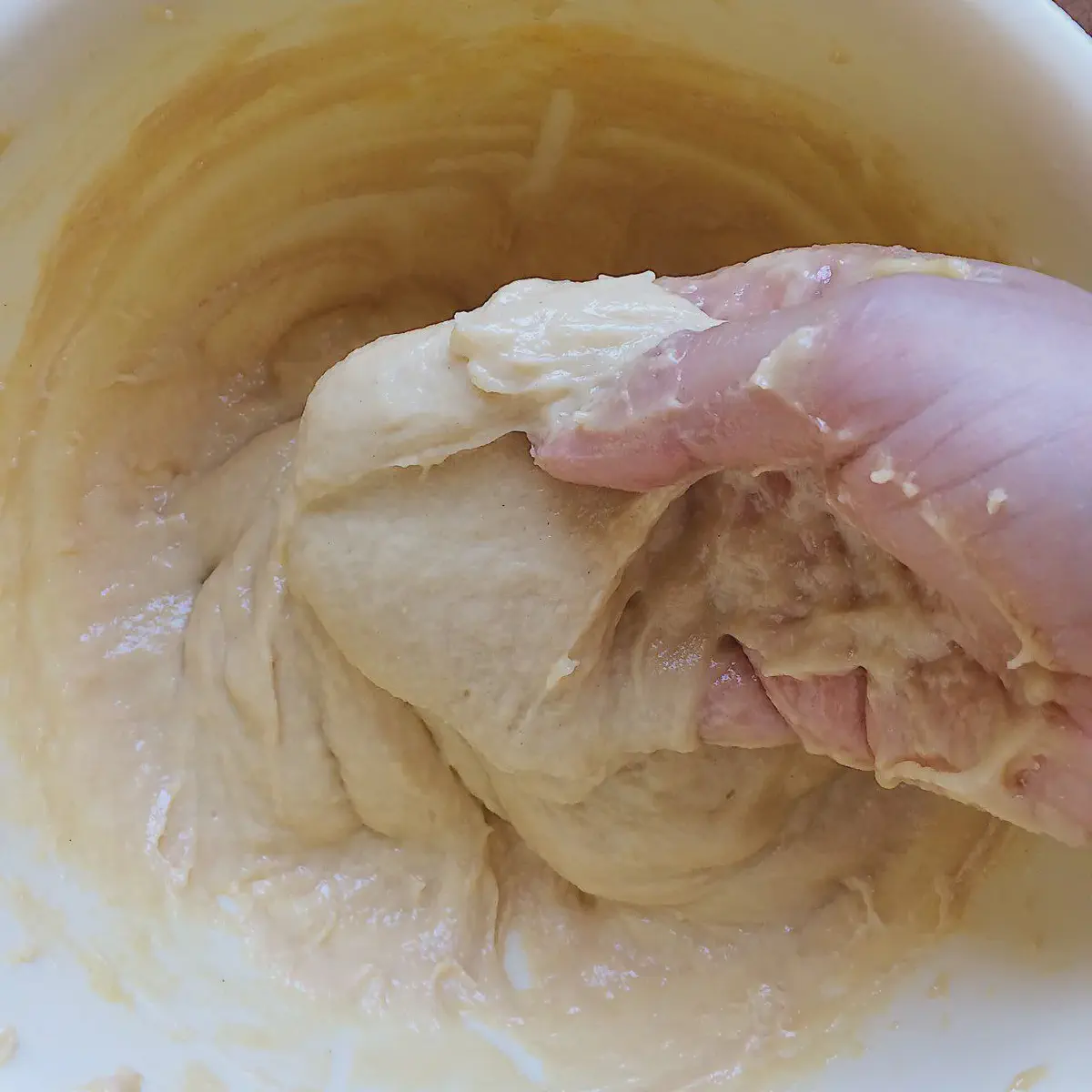 При ручном вымешивании, в тесте могут чувствоваться крупицы дрожжей — это нормально, они разойдутся при выстаивании.