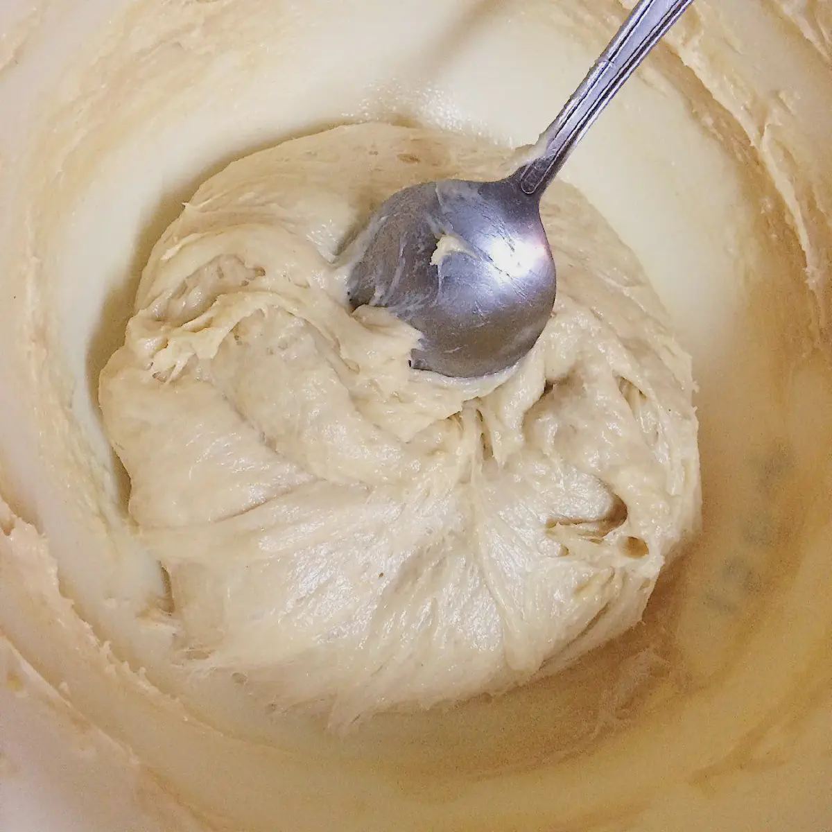 После охлаждения — размешайте тесто ложкой, или спалутой