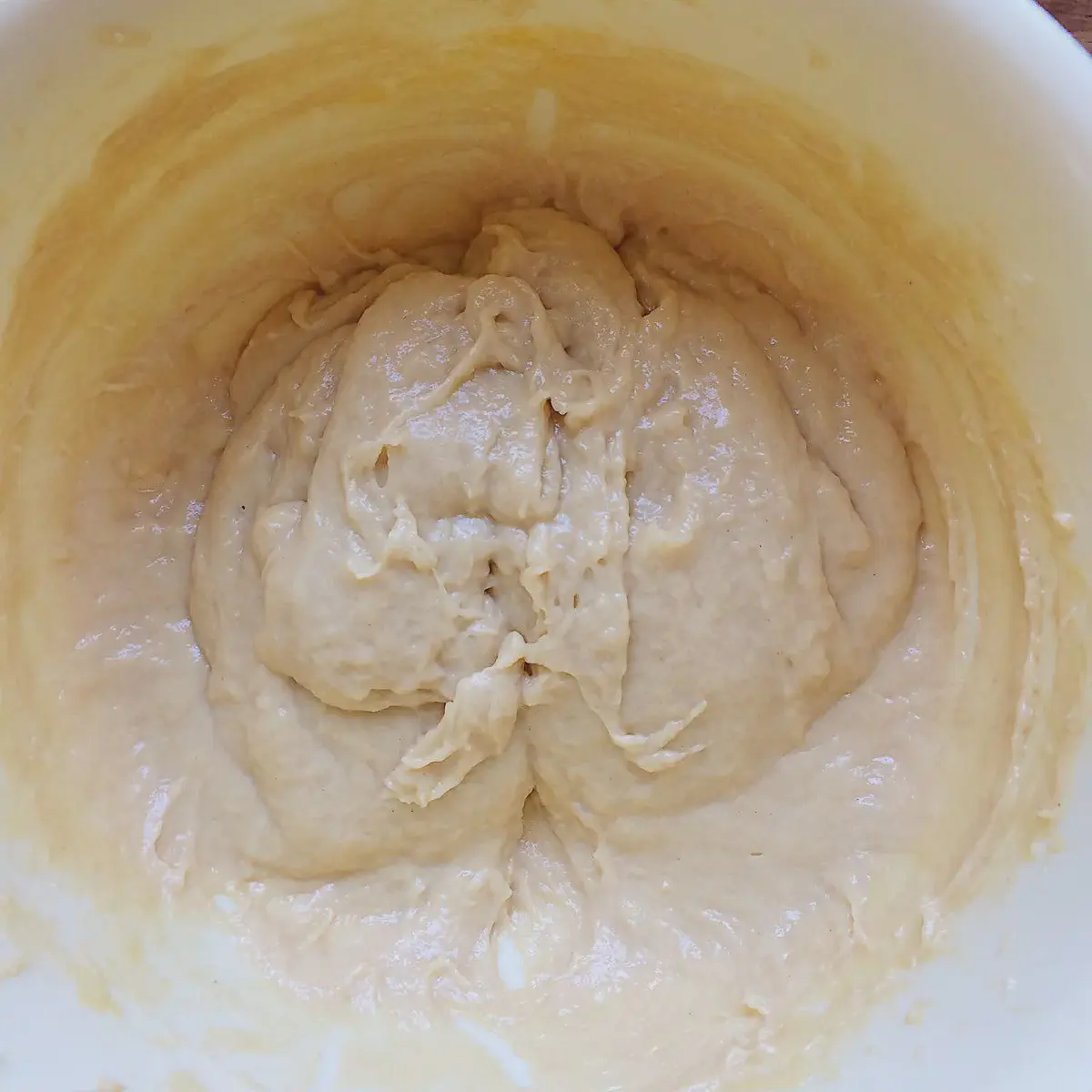 Хорошенько вымешиваем венчикомПоначалу тесто может показаться густым, просто продолжайте мешать. Если оно слишком густое для вымешивания, значит вы добавили много муки, в этом случае добавьте чуть-чуть яиц (вычтя этот объем из 3 этапа)