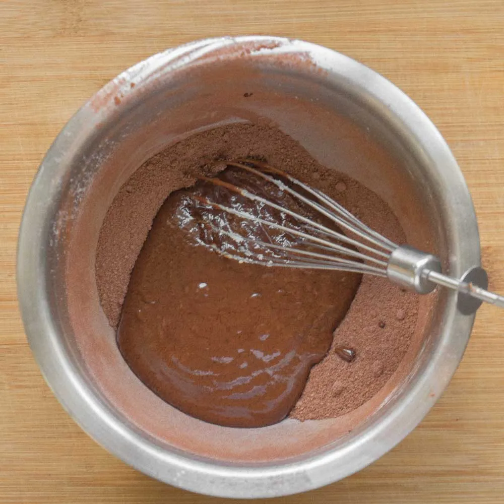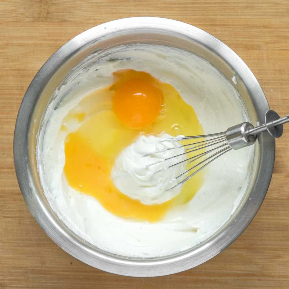 Добавляем яйца (70 гр.) — одно целое, и остаток с брауни. Хорошенько размешиваем до однородности.