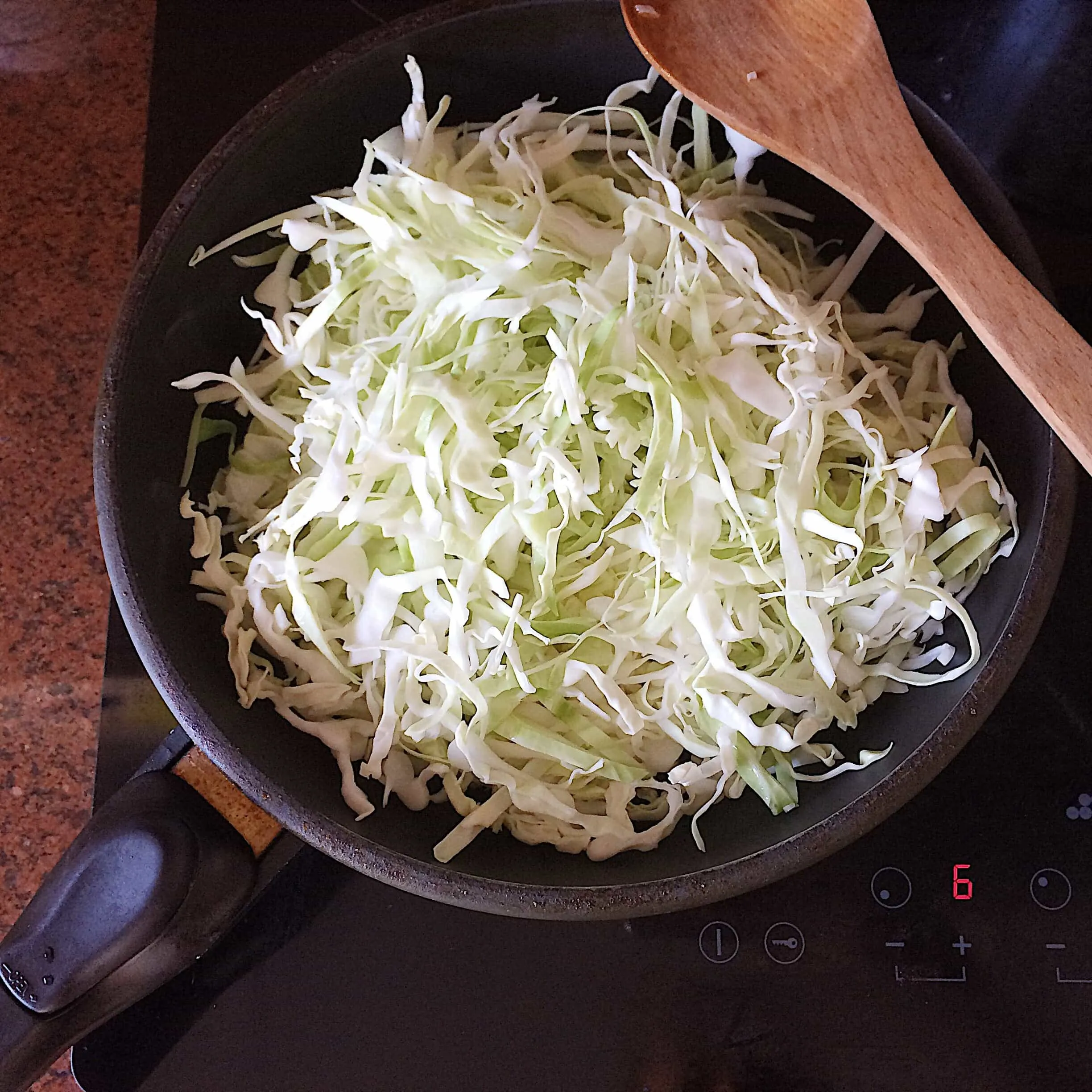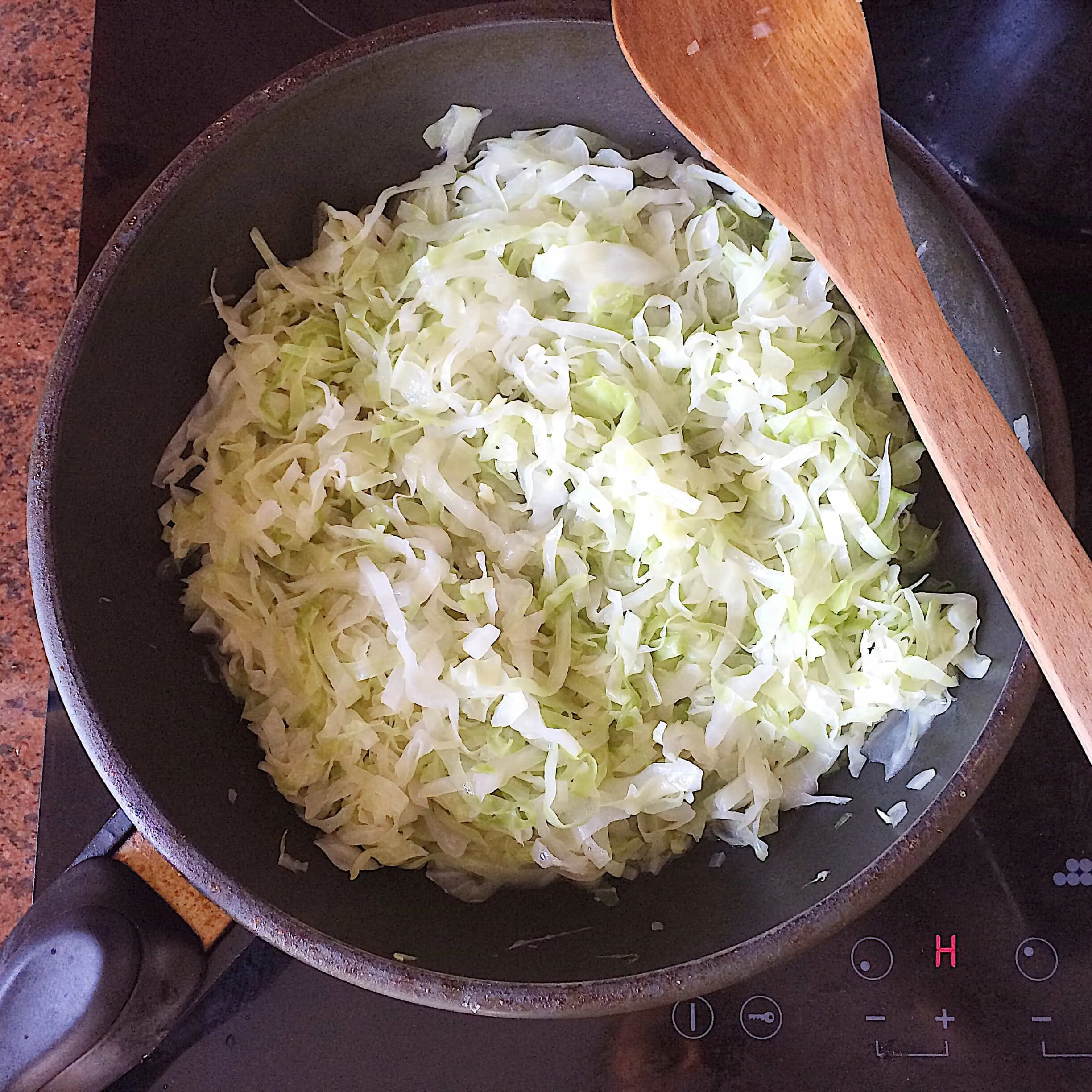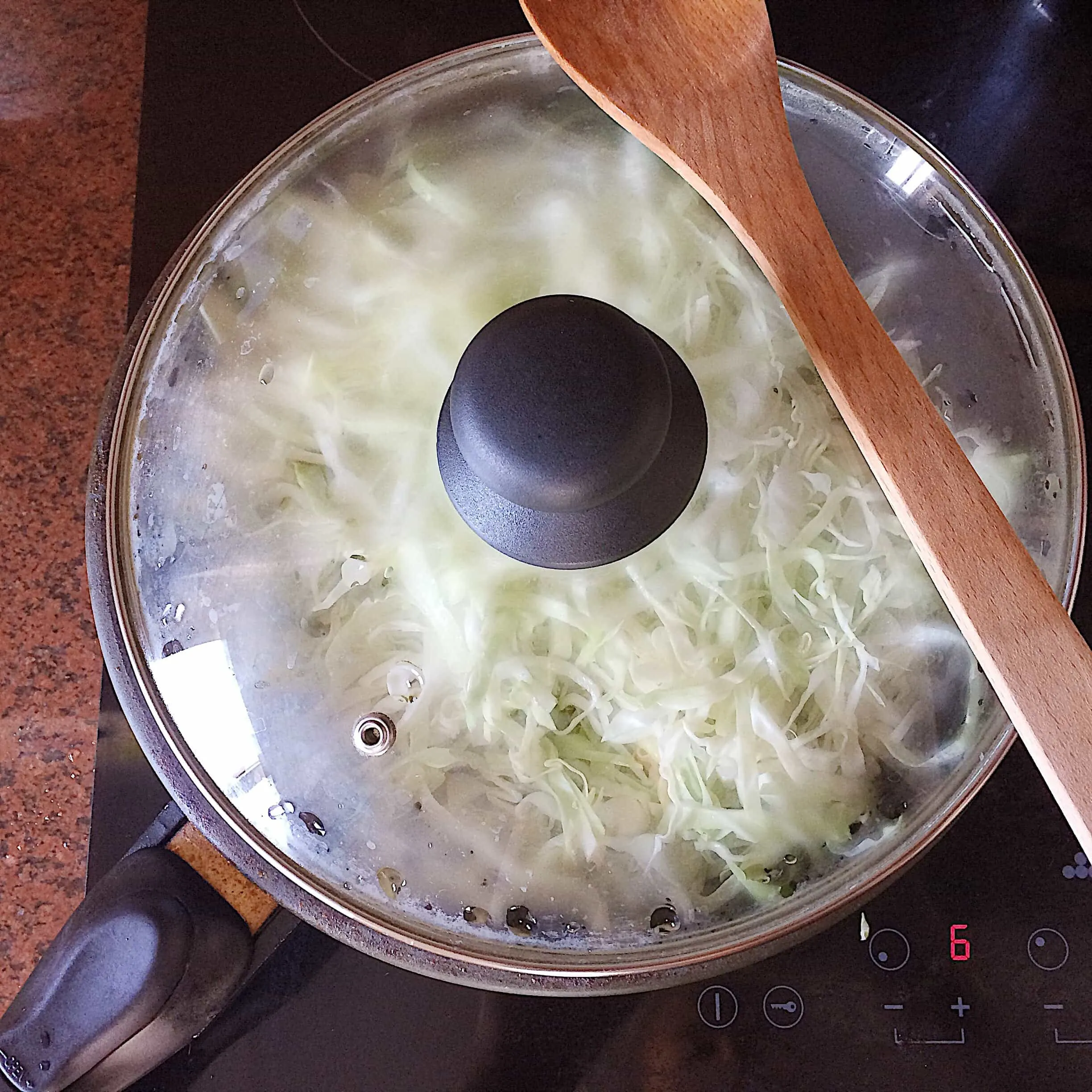 Снижаем нагрев (6 из 9), добавляем капусту, наливаем чуть-чуть водички, и накрываем крышкой. Тушим минут 5-7 до полуготовности. Здесь важно оставить капусту светлой и слегка хрустящей. Периодически снимайте крышку, перемешивайте, подсаливайте, пробуйте на зуб. Если нужно — долейте еще воды.