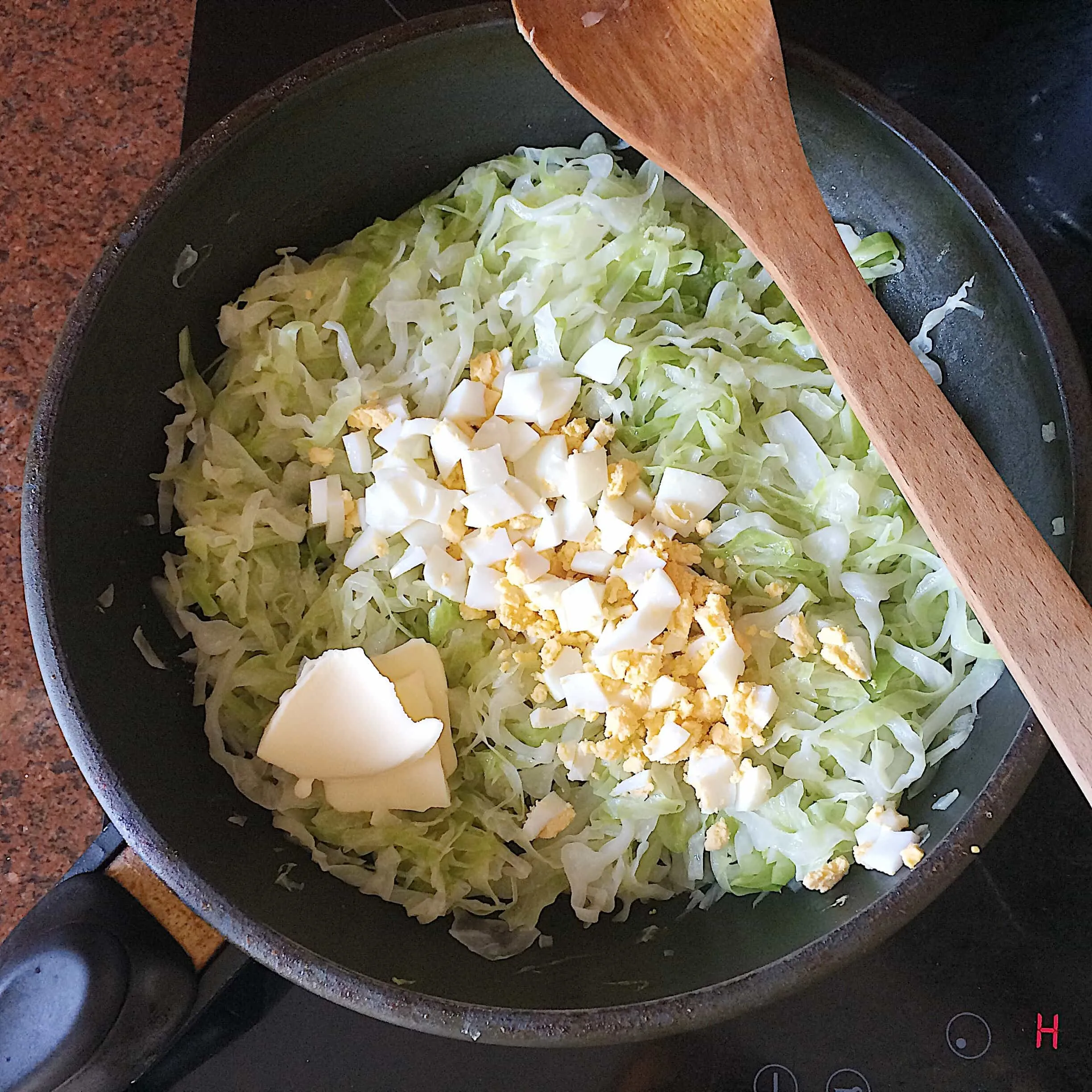 Как только капуста дошла до нужной кондиции, выключаем нагрев, добавляем ∼0.7 ст.л. слив. масла (слайс 4-5 мм толщины), и яйцо. Если нужно — еще подсолить.