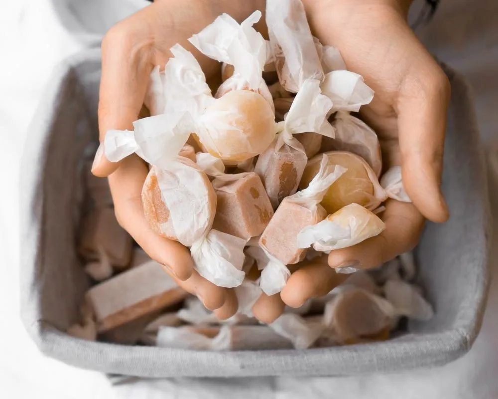 Выливаем смесь в форму, даем остыть при комнатной температуре, и разрезаем ножом. Упаковываем индивидуально — конфетки будут слипаться, если хранить их кучкой.