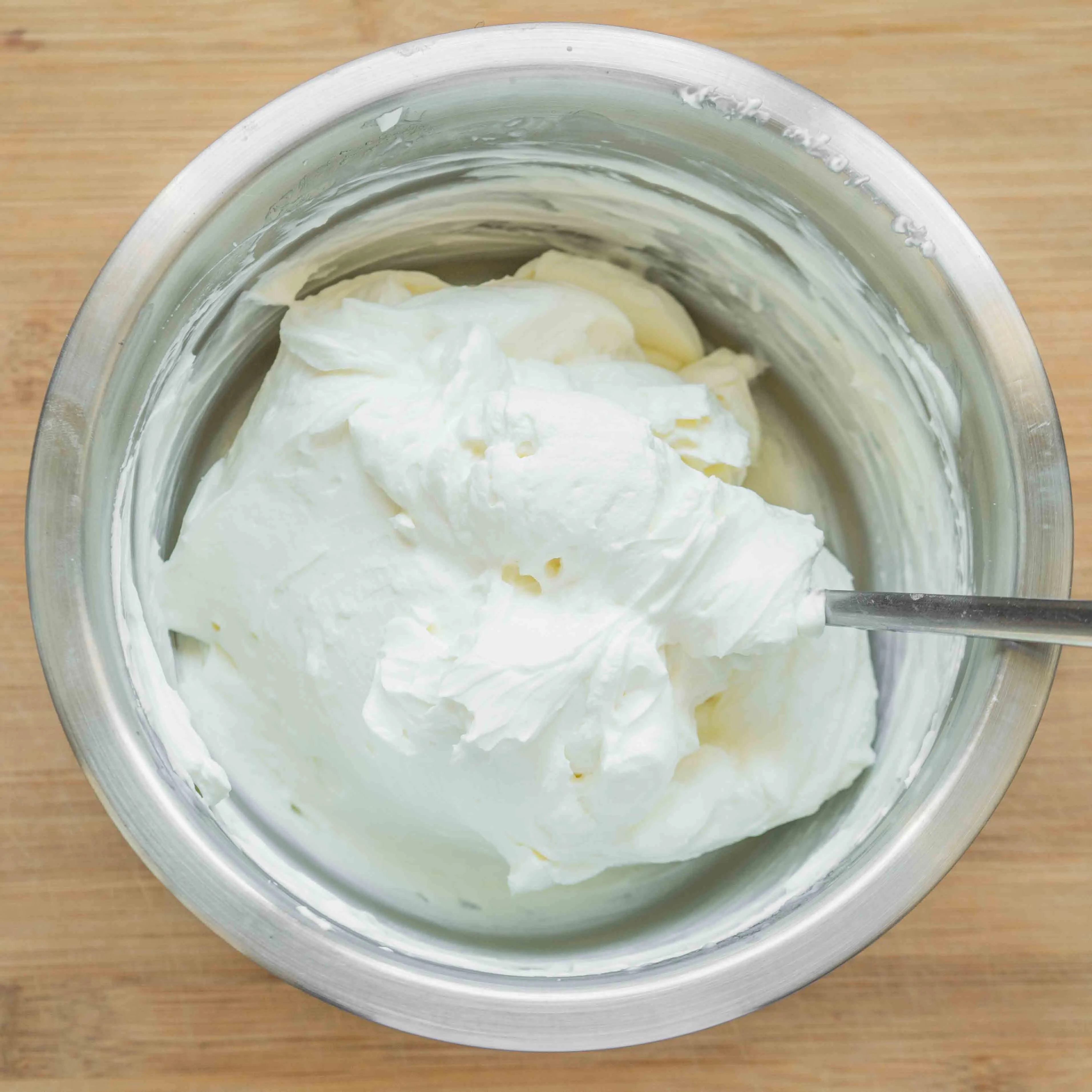 Чтобы в креме не было цельных комочков сыра, перед использованием тщательно разомнем его лопаточкой, или ложкой — до гладкого однородного состояния. Актуально, если мешаете большую порцию, и эти кусочки могут просто не захватиться. На маленьких объемах этого обычно не происходит.