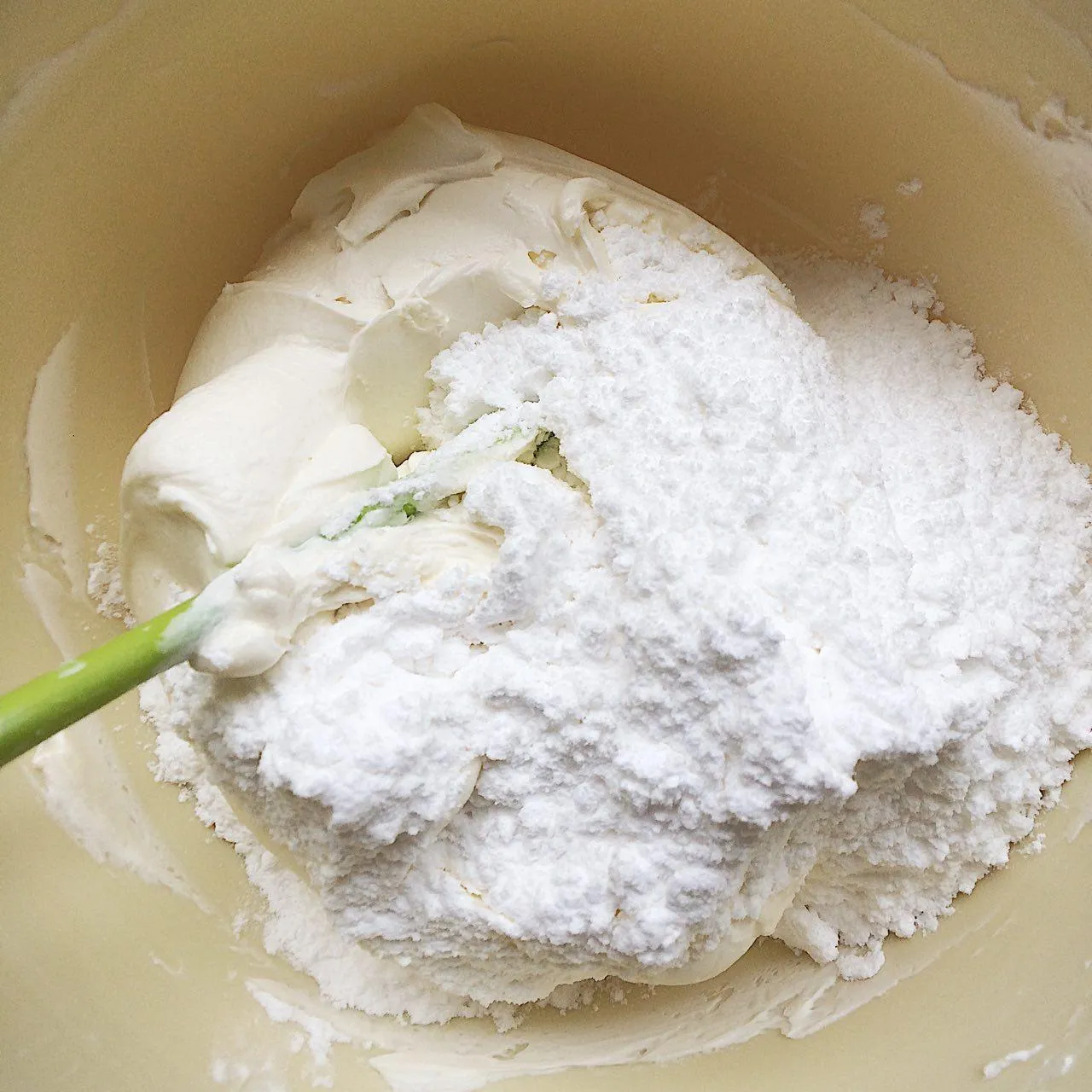 Сразу же вмешиваем в него сахарную пудру, чтобы потом она не летела во все стороны. Этот этап можно пропустить — наша задача тупо взбить сливки, и смешать их с сыром и пудрой.