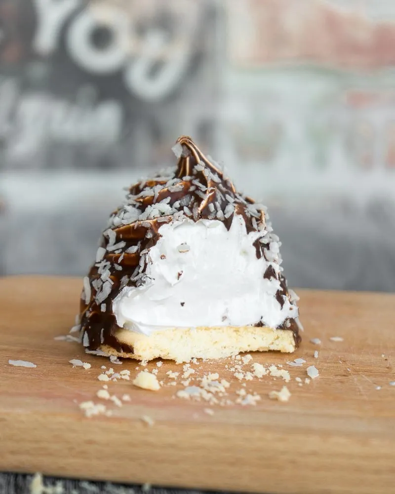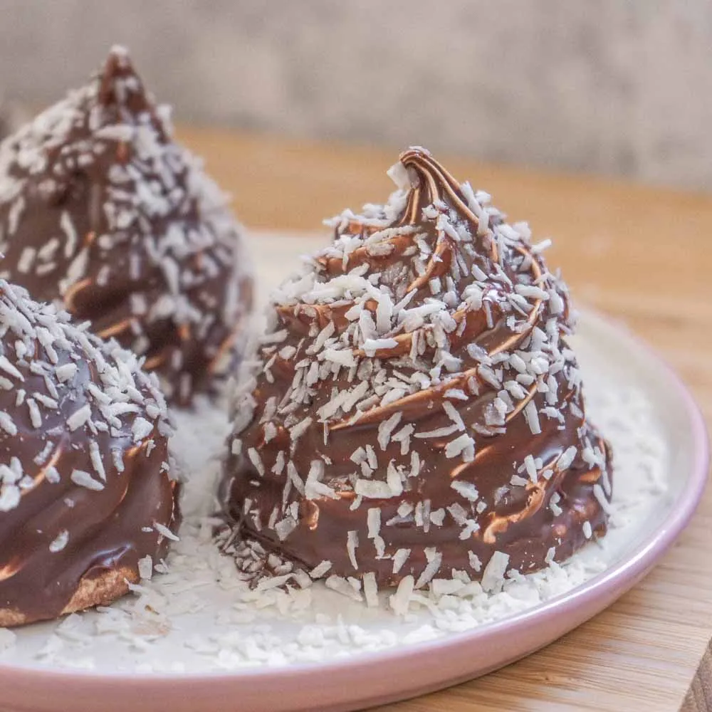 Оказалось, это обычная меренга на непонятной сыроедческой основе типа “смешай финики и орехи”. Основа мне не понравилась — она была слишком мягкой и сладкой, но сама идея… В итоге я скрестила датский flødeboller и русскую корзиночку, сделав основу из рассыпающегося песочного теста с кокосовой стружкой, и оно мне кажется более привычным что-ли — все же помнят корзиночку с белковым кремом? Почти то же самое, но с дополнительной хрустяшкой из шоколадной глазури. А если в центр положить чайную ложечку кисленького фруктового джема…ммм…