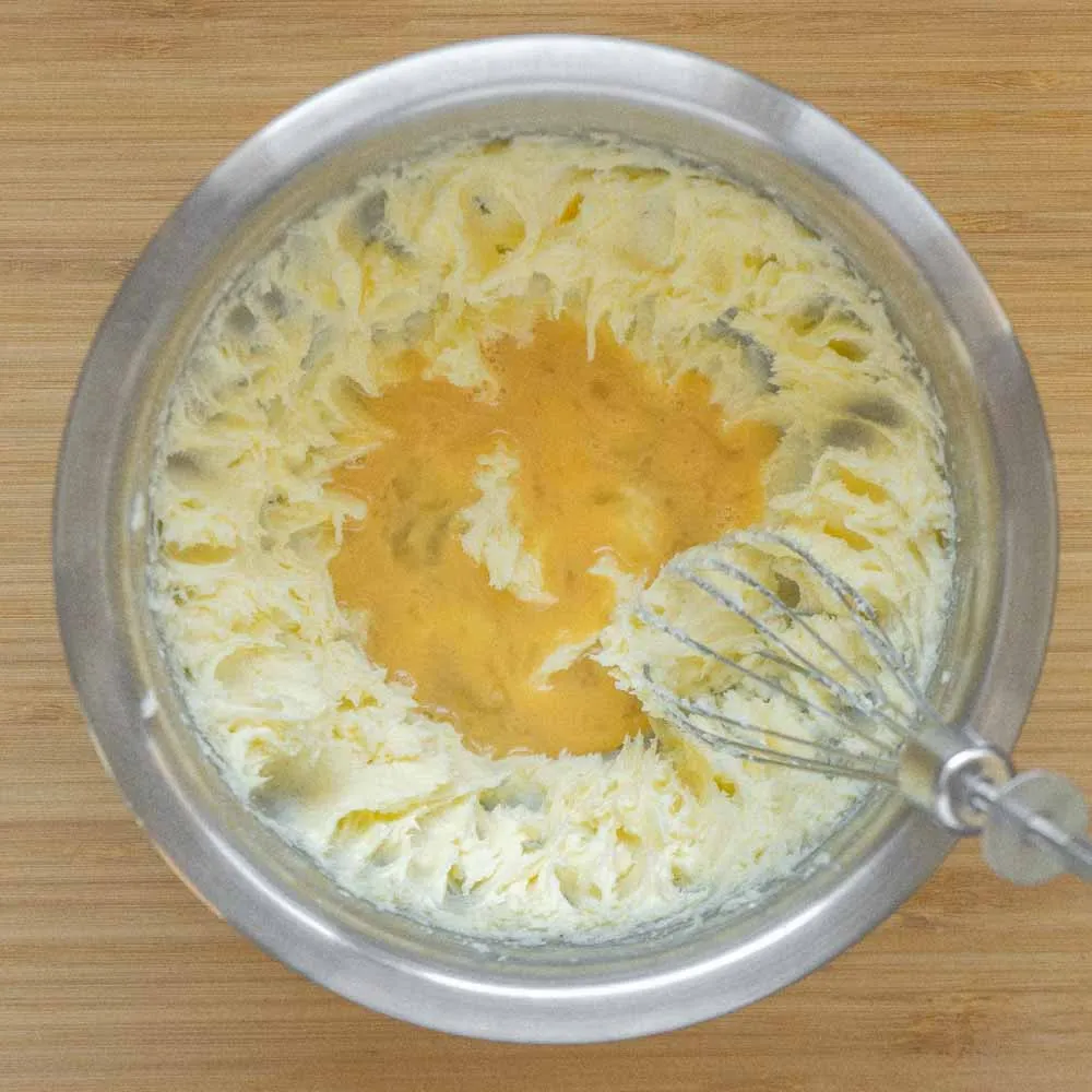 В миске взбиваем сливочное масло и сахарную пудру (40 гр.) до однородного пышного состояния. Добавляем желток (1 шт.) и ванильный экстракт, взбиваем до однородности.
