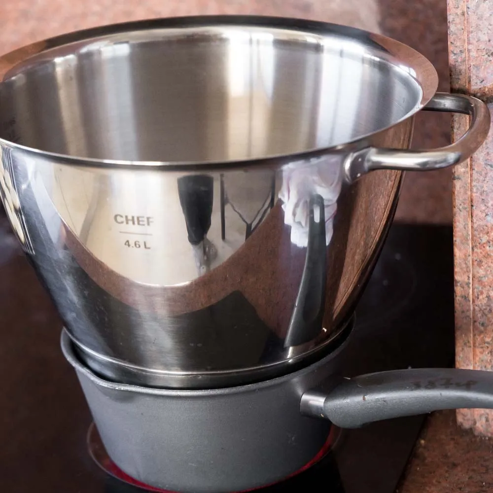 Белки (160 гр) соединяем с сахаром (320 гр.) в чаше миксера, или другой термоустойчивой миске. Ставим на водяную баню, нагрев — средний, чтобы температура не поднялась слишком быстро, и сахар успел раствориться до начала взбивания. Нагреваем до температуры 50-55°С, постоянно помешивая венчиком — просто помешиваем, стараемся растворить сахар, взбивать не нужно.