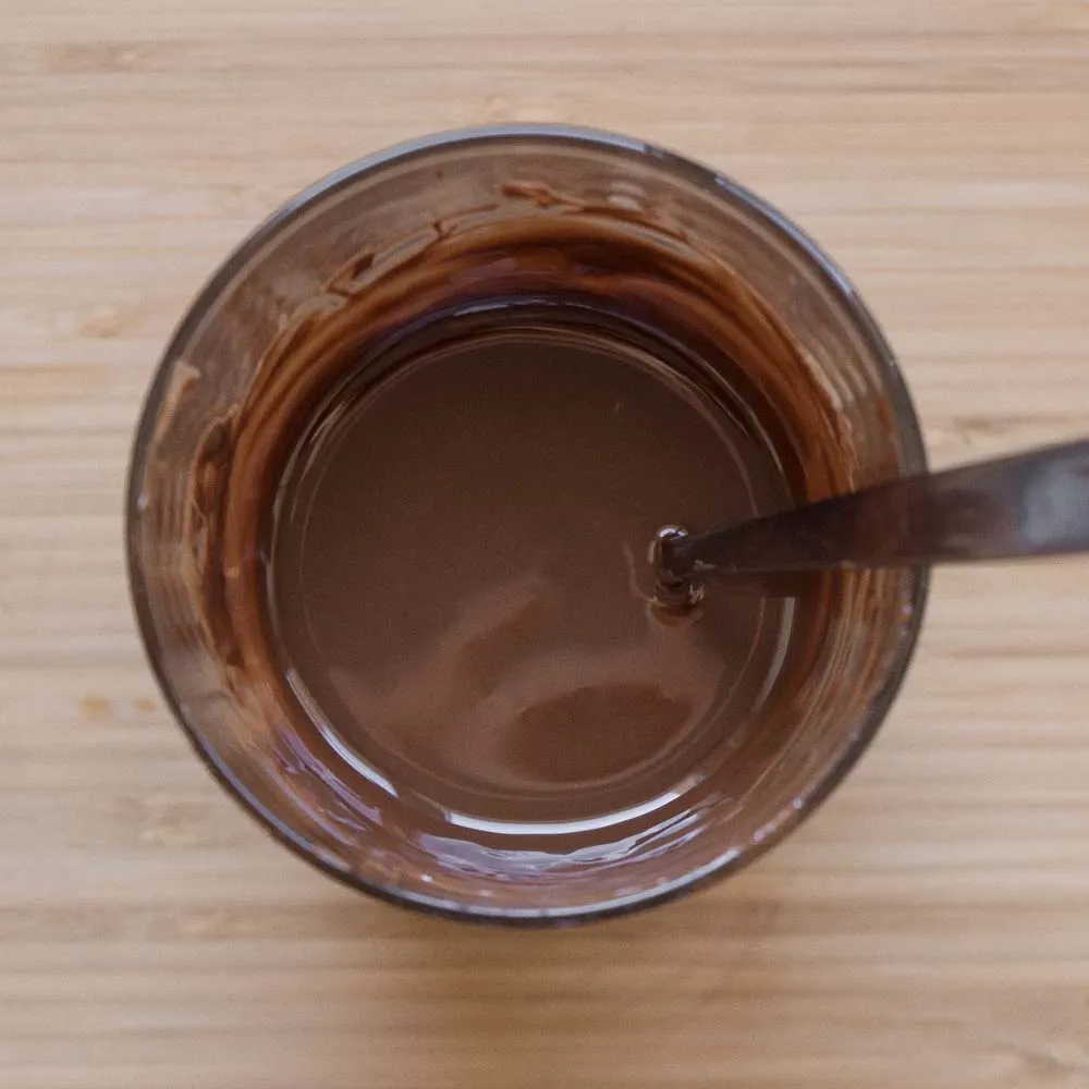 Для глазури растапливаем шоколад (300 гр.) в микроволновке импульсами, или на водяной бане, добавляем растительное масла без запаха/вкуса (90 гр.) и хорошенько размешиваем. Возможно, у тебя уйдет больше шоколада, потому что надо найти миску/стакан, в которые заготовка поместится полностью (по высоте), и ты сможешь вытащить ее — она должна быть широкой, чтобы пальцы пролезли вместе с печенькой…
