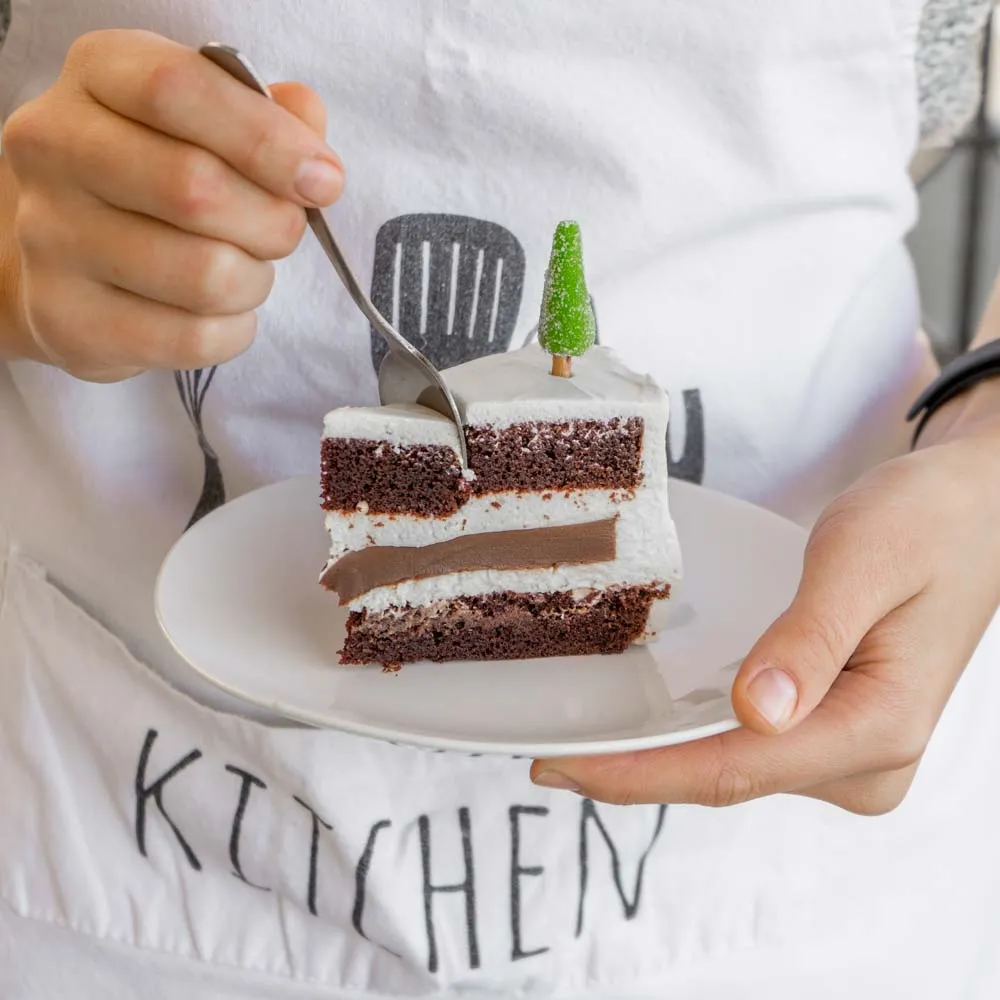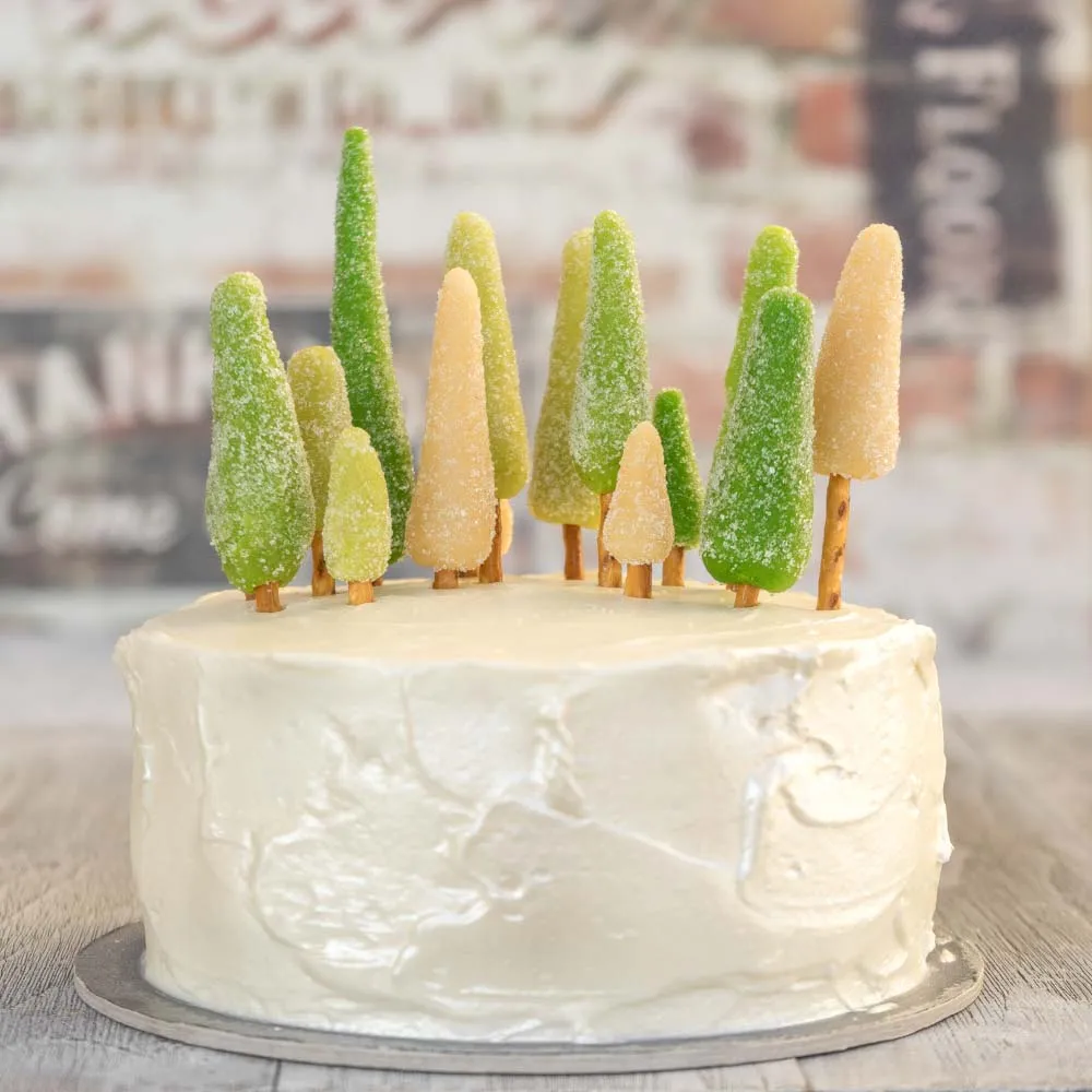 Перед подачей втыкаем елочки полукругом, ближе к задней части торта, чтобы перед ними получилась полянка.
