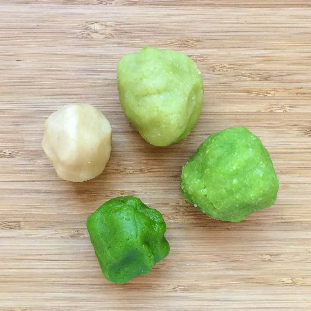 Елочки можно сделать заранее, и хранить в холодильнике. Для них мы берем марципан, и смешиваем его с зеленым красителем, чтобы получить 4 разных оттенка зеленого — в одну порцию добавляем совсем чуть-чуть, в другую — одну-две капли красителя, и далее по нарастающей.