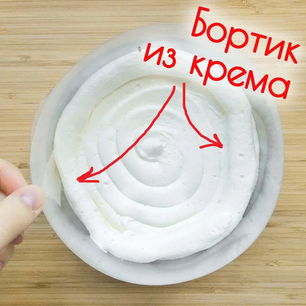 Выдавливаем крем ровным слоем, и вторым формируем бортики для начинки (иначе она потом будет мешать выравнивать торт). Вкладываем начинку. Если начинка из холодильника — просто размешай ее хорошенько, без разогрева, и выложи одним толстым слоем из мешка (можно из обычного плотного полиэтиленового пакета).