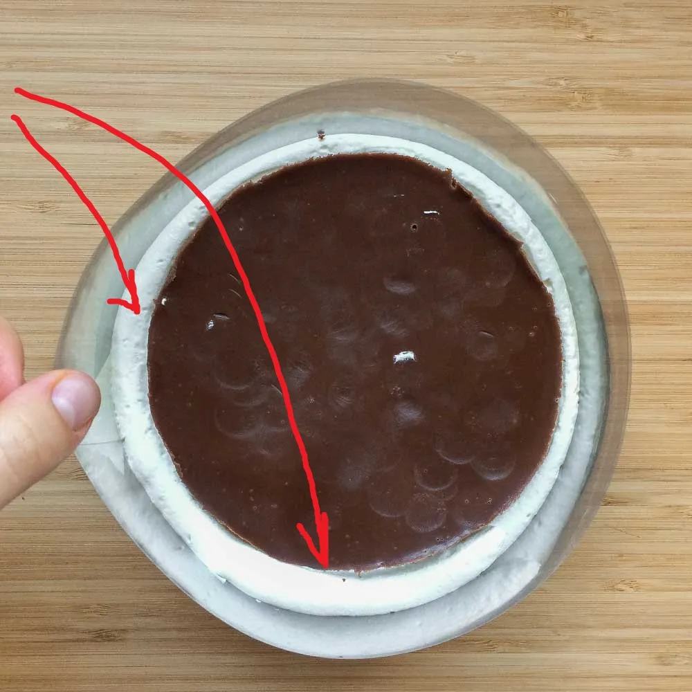 Если не хочешь заморачиваться с ровной начинкой, то просто убери ее в холодильник — во время сборки она должна быть достаточно холодной, чтобы держать форму и не растекаться по всем щелям.