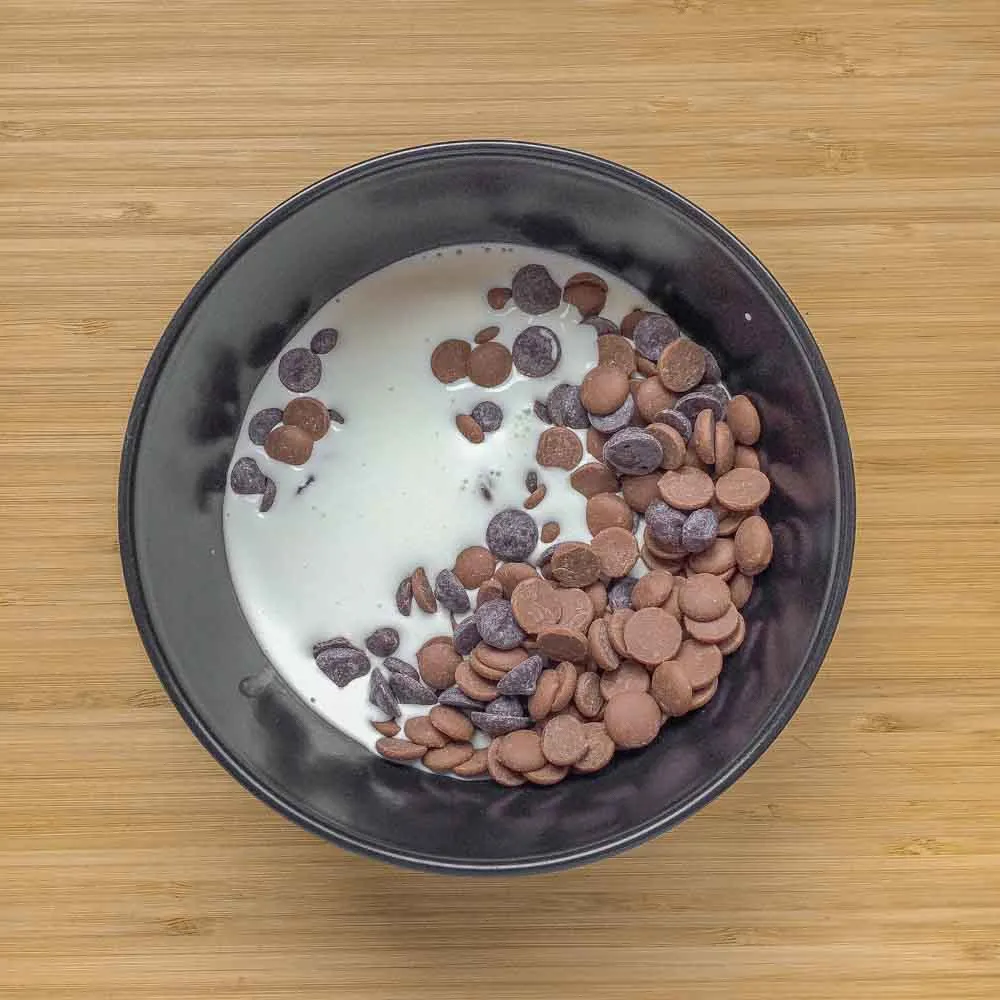 Нагреваем смесь в микроволновке импульсами по 20-10 секунд, каждый раз хорошенько перемешивая смесь, чтобы шоколад не перегрелся. Можно растопить шоколад на водяной бане, или просто залить кипящими сливками. Мне проще в микроволновке.