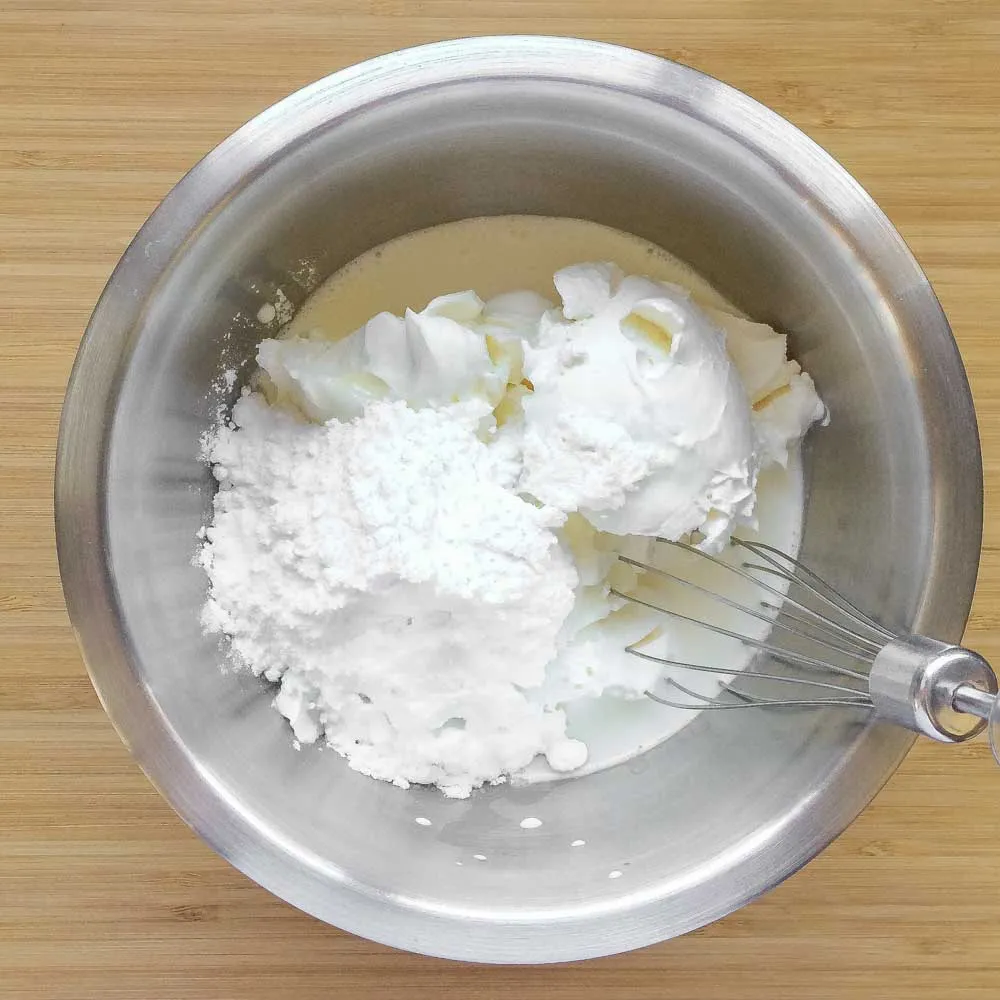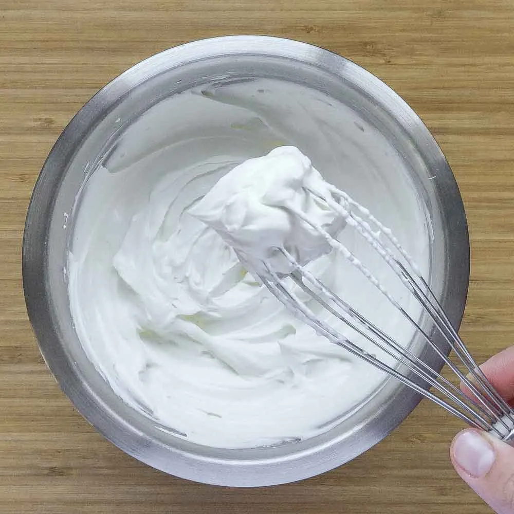 Готовим крем. Для этого соединяем сливочный сыр (520/800 гр.), сливки 33% (130/200 гр.), и сахарную пудру (90/140 гр.) в одной миске, и взбиваем до устойчивых пиков. Если сомневаешься, что твой миксер сможет взбить все сразу — сначала взбиваешь сливки и пудру до устойчивости, потом добавляешь сливочный сыр и проходишься пару раз до однородности.