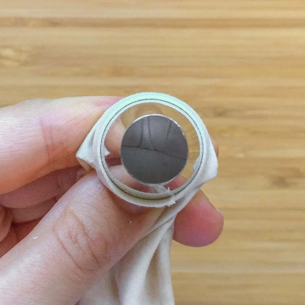 У меня нет маленького кольца, поэтому я закрепляю ацетатную пленку внутри пластикового кольца, отпиленного от баночки с раменом из службы доставки… =DDD и не забываем про пленку снизу, иначе не отодрать.
