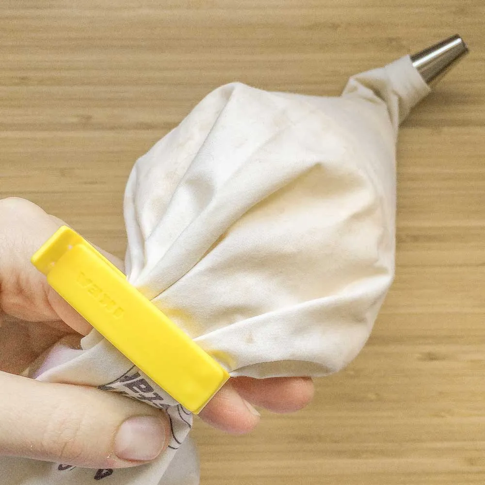 Выкладываем крем в кондитерский мешок с круглой насадкой. Для надежности можно закрепить его прищепкой.