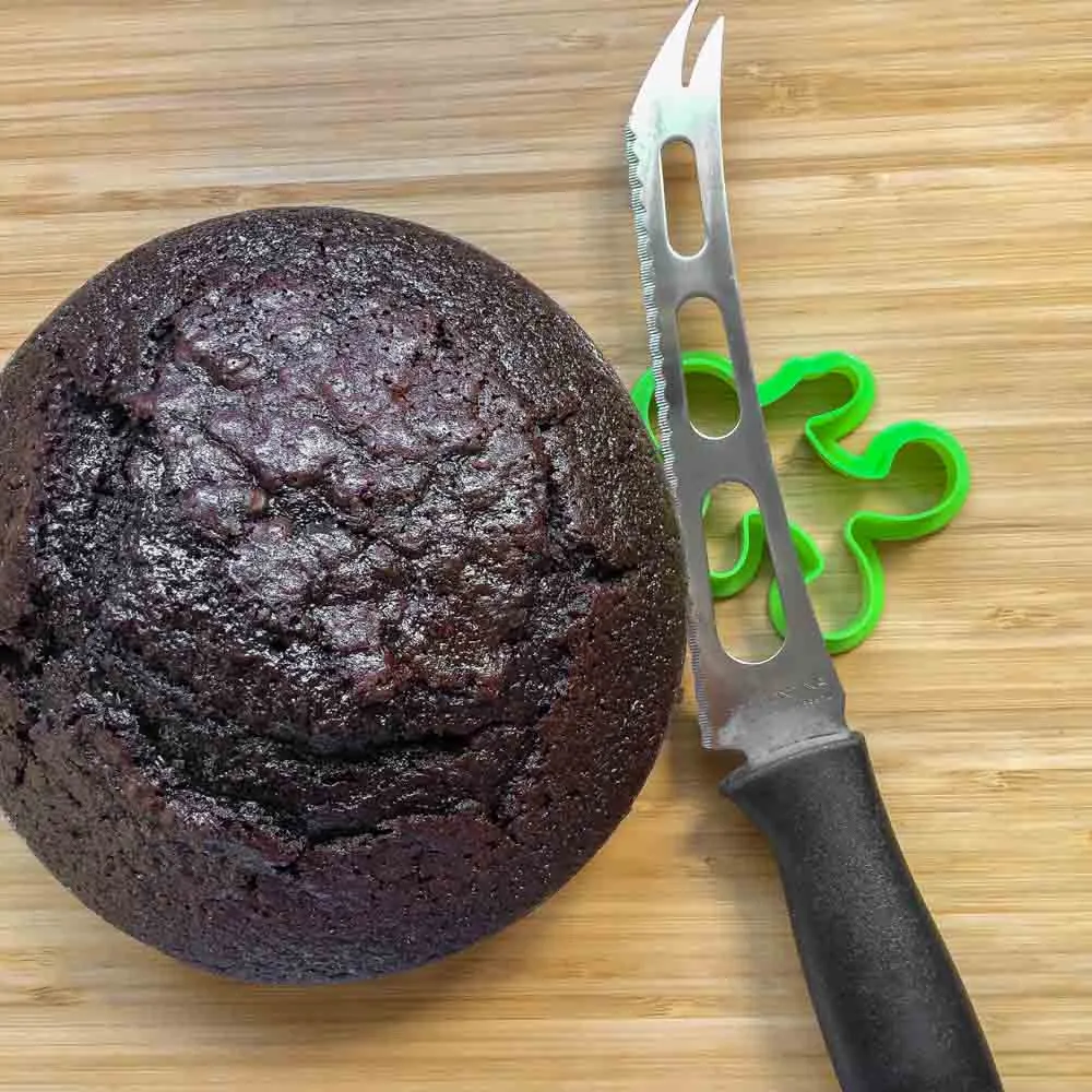 Режем бисквит на два коржа — с помощью направляющих прорезаем острым ножом по периметру, а потом насквозь (удобно ниткой). Шапочку тоже срезаем. Нужны два ровных бисквита.