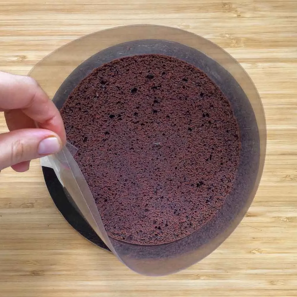На подложку выдавливаем немного крема, чтобы прилепить бисквит. Выкладываем первый корж, и обматываем его ацетатной пленкой, или аналогом — это нужно, чтобы края были ровные, и торт не заваливался набок. Если есть разъемная форма нужного диаметра, можно использовать ее.