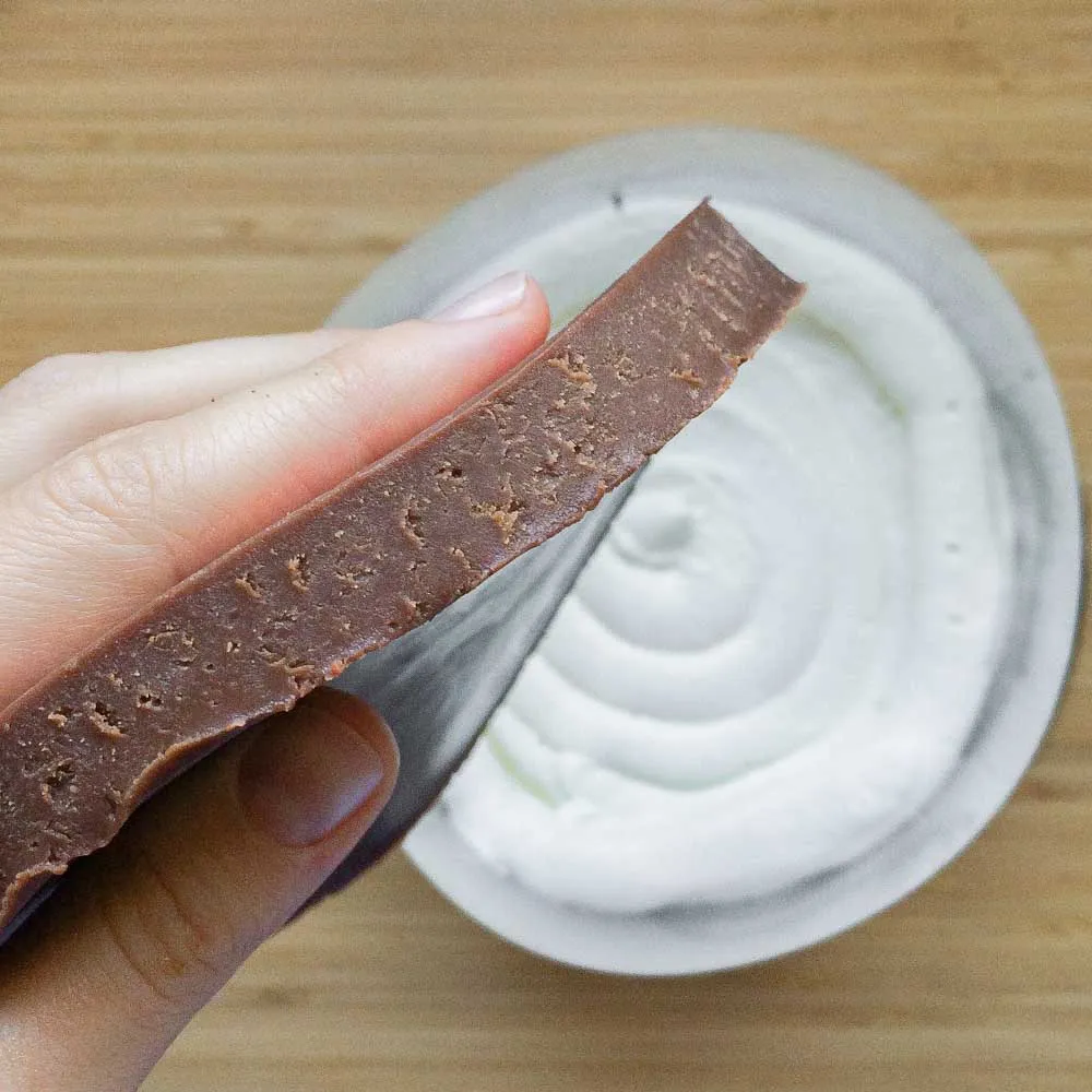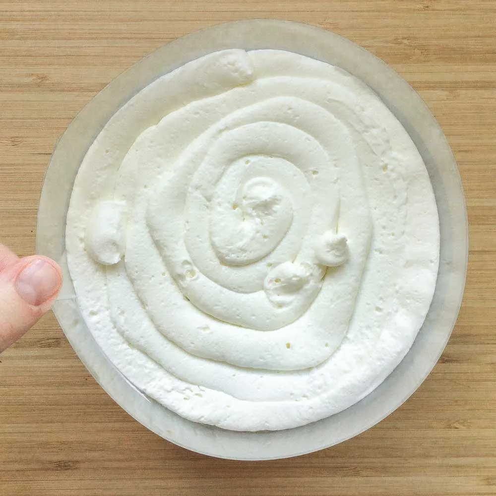 Если хочешь ровную начинку, то лучше заморозить ее заранее в виде большой шайбы — тогда разрез будет идеальным. Но можно особо не заморачиваться, и выложить ее во время сборки, главное чтобы она была холодной.