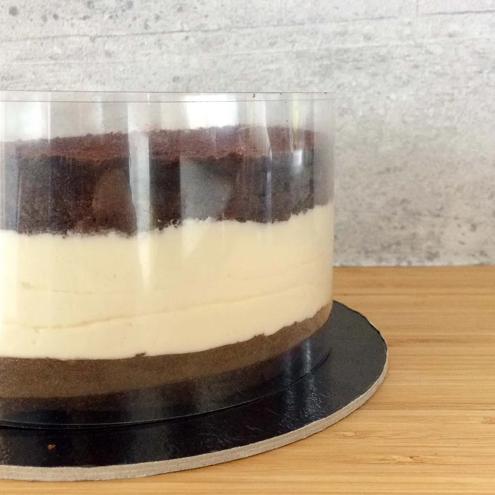 Для идеально ровной начинки, заморозь ее в кольце на 16см. Ø (на 2 см. меньше, чем бисквиты), это важно, иначе она будет торчать во время сборки. Если есть железное кольцо — обтягиваешь его пленкой снизу, и по бортику вставляешь ацетатную пленку, или аналоги (файлик, например) — нам надо добиться гладких бортиков, пленкой такие не сделаешь.