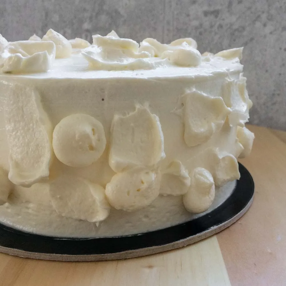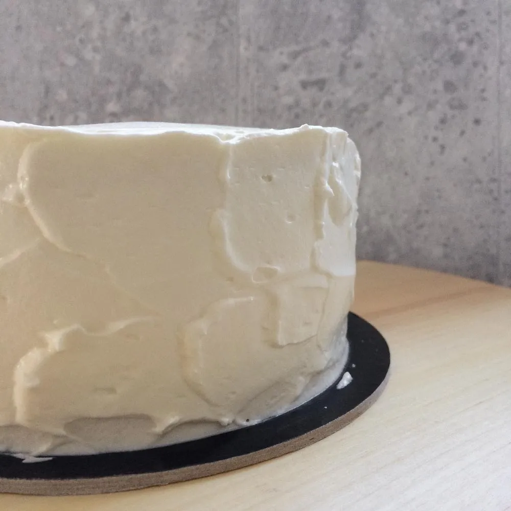 Обмазываем торт кремом — для этого покрываем верх и бока слоем крема в ∼5мм, ни чего не пропускаем — так будет проще выровнять без черновой обмазки.