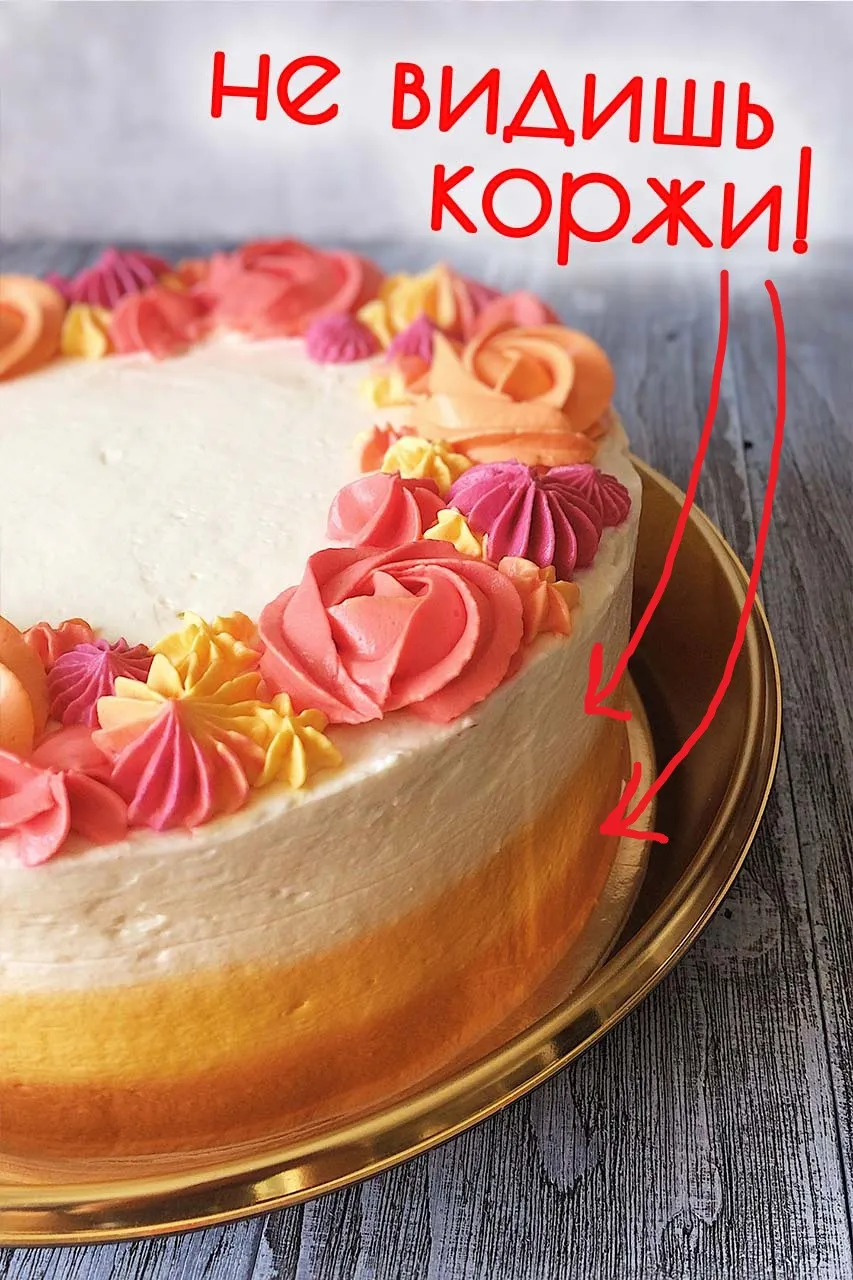 Смотри — без спец.инструментов и больших навыков, у нас получился практически идеальный торт — ровные бисквиты, начинка и прямые бока. Тяжелые украшения на него лучше не ставить — начинка может выдавиться.
