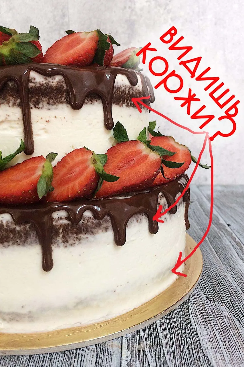 Для голого торта крем идет только внутрь, при этом сбоку видно коржи. Для торта с полной обмазкой, бок тоже закрывается кремом: