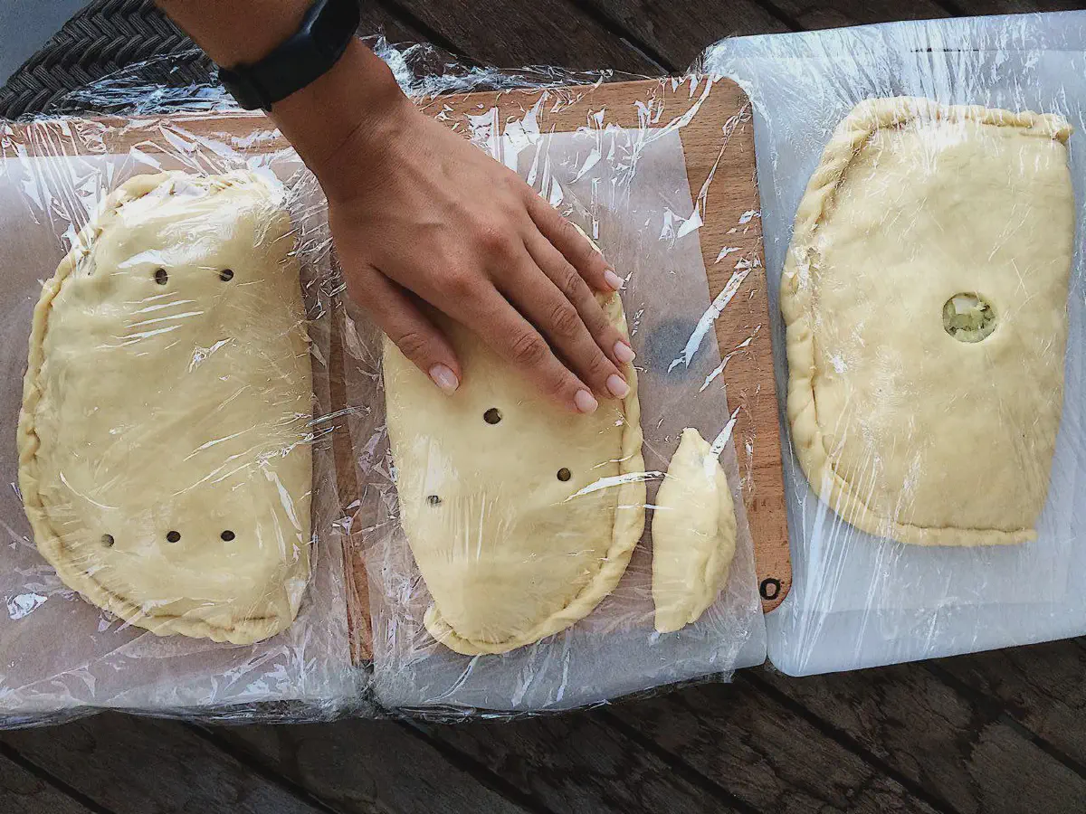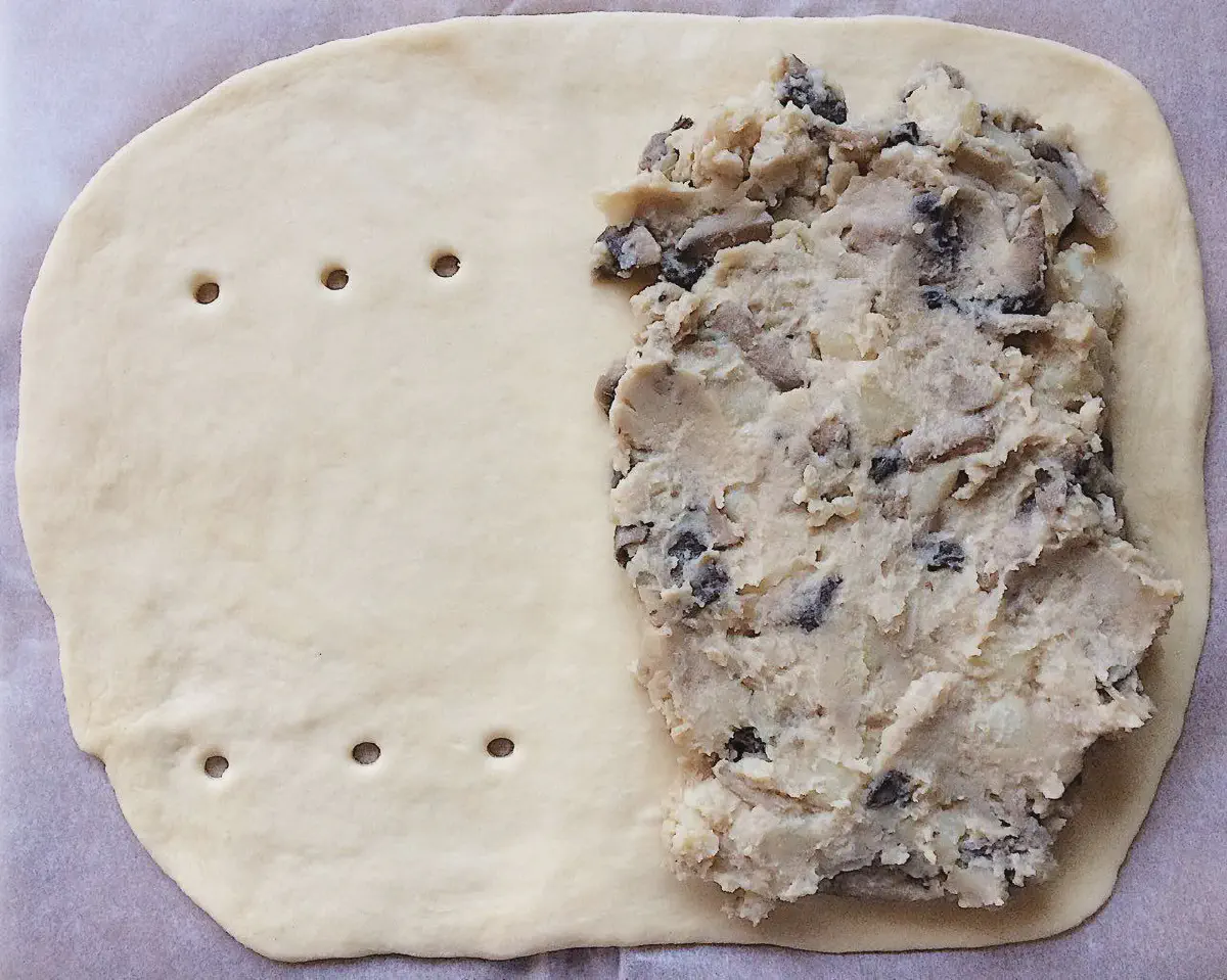 Чуть-чуть смазываю свободный край теста у начинки водичкой, закрываю кулебяку как книжку, и закрываю внахлест. Можно завернуть жгутиком, но рисунок не особо будет виден.