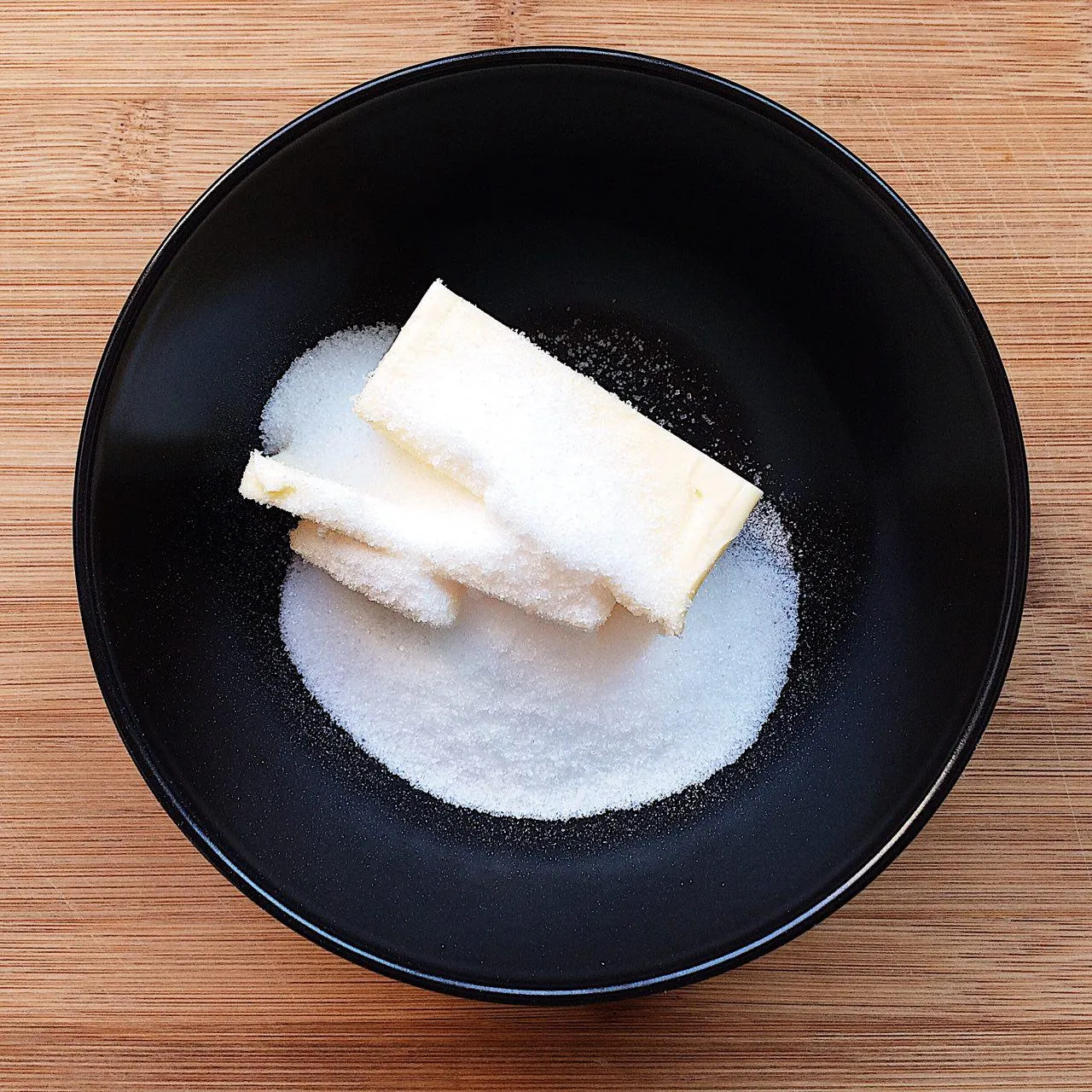 Достанем масло (90 гр) из холодильника, разрежем на брусочки в 1 см, выложим в глубокую тарелку, и засыпем сахаром (45гр). В таком виде оно успеет согреться к нужному моменту, и потом не надо будет бегать и отмерять сахар в середине замеса.