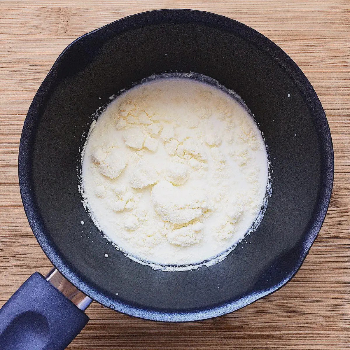 В сотейнике смешиваем молоко (100 гр), сухое молоко (15 гр), соль (маленькая щепотка) и мед (10 гр). Нагреваем на среднем огне, постоянно помешивая, чтобы молоко не прикипело ко дну. Сейчас нам нужно добиться однородности смеси, и нагреть ее достаточно, чтобы растопить шоколад, так что доводить до кипения не нужно – как только начал подниматься пар, убираем с плиты.