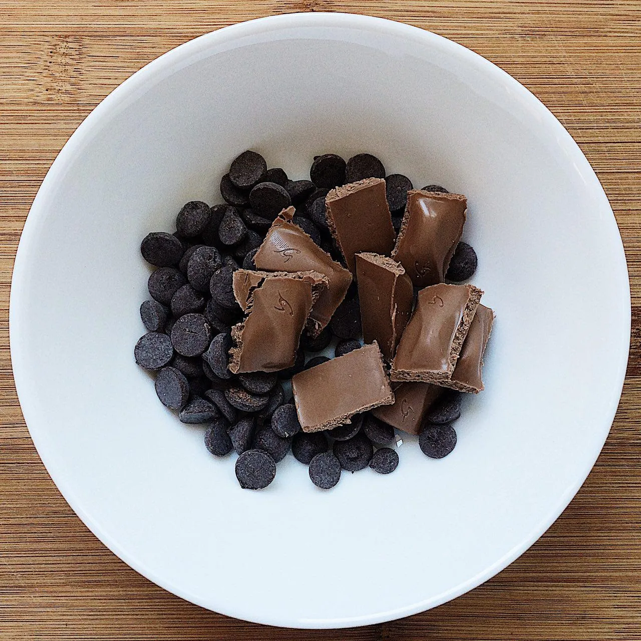Мы берем два вида шоколада, чтобы получить более сложный вкус. Темный шоколад менее сладкий, чем молочный – если решите делать все с молочным, уменьшайте или совсем убирайте сахар. Если берете горький вместо темного – увеличивайте сахар.