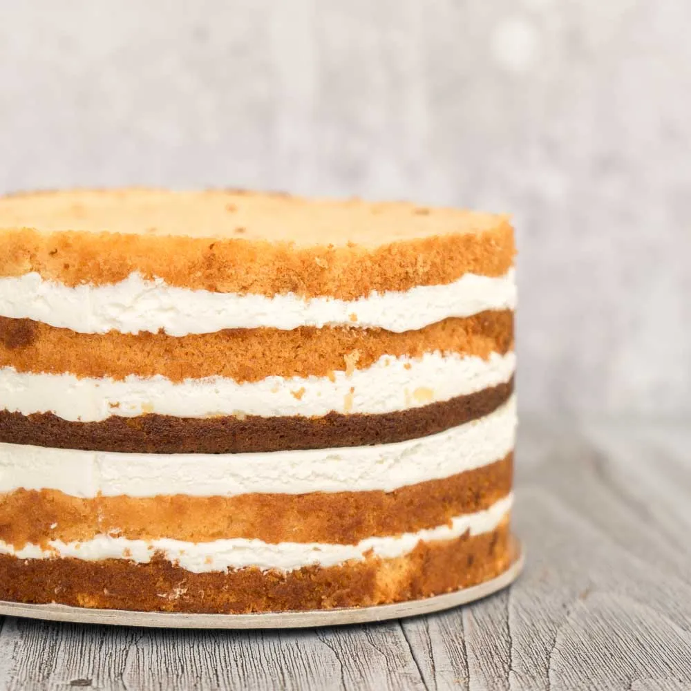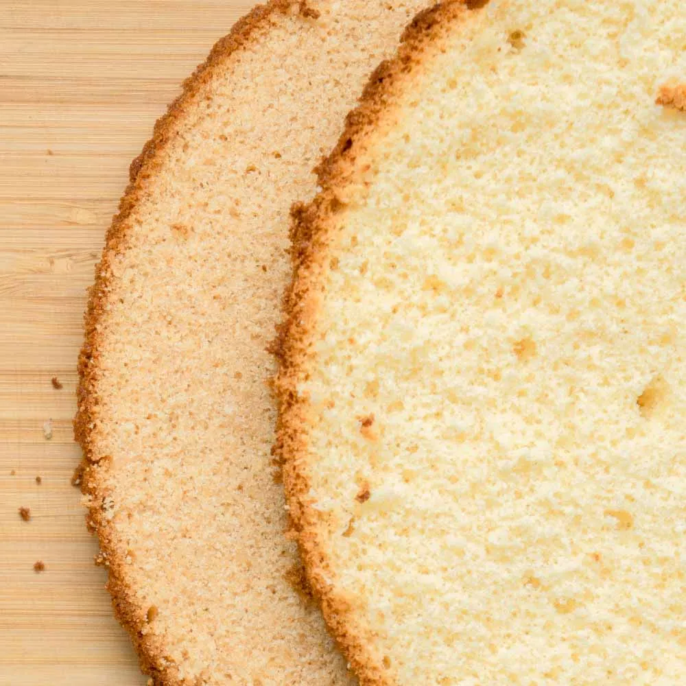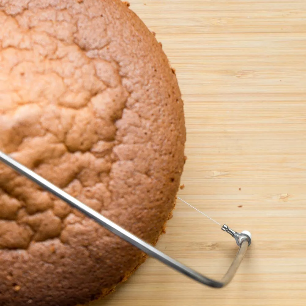 После отлёжки режем бисквит на коржи в 1 см толщиной — можно с помощью струны, а можно ножом с зубчиками — главное найти направляющие в 1см, чтобы коржи были ровные. Прорезаем на 1-2 см. вглубь, и добиваем ниткой.