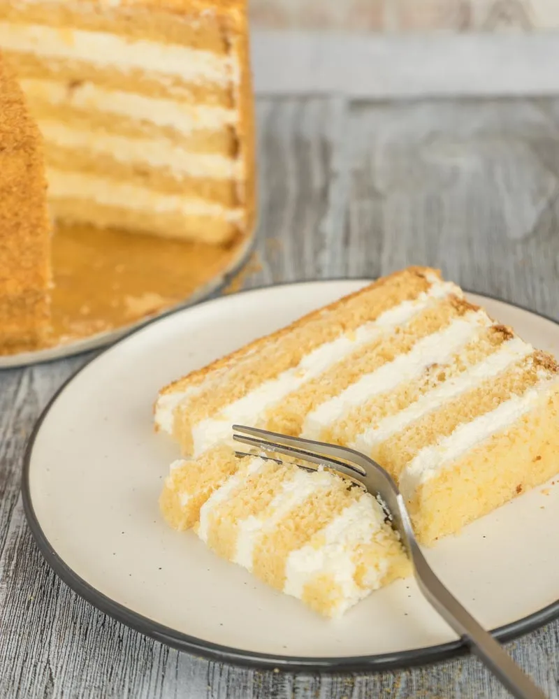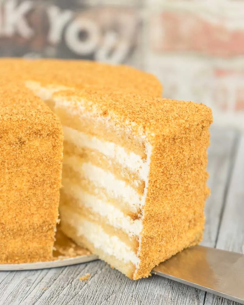 Это просто волшебный торт! Невесомый нежный воздушный со сметанным кремом и легким медовым послевкусием. Ты отламываешь кусочек, и слышишь как лопаются пузырьки воздуха в коржах и креме — такое тихое потрескивание. Остановиться невозможно — даже после плотного ужина, в тебя поместится четверть торта. Проверено.