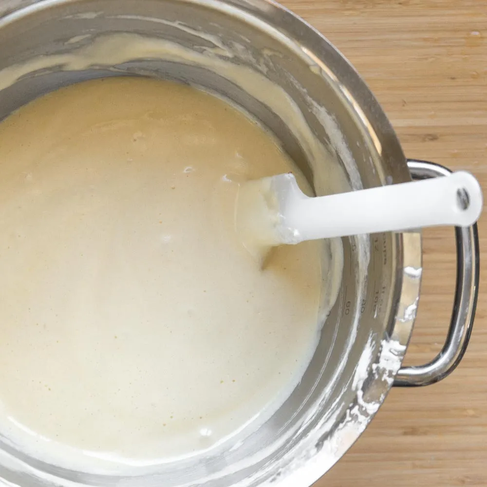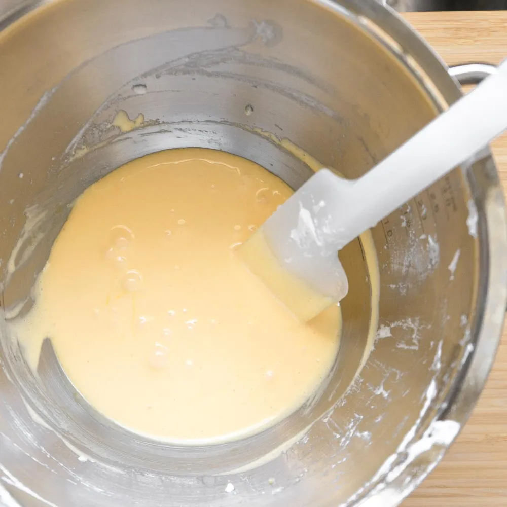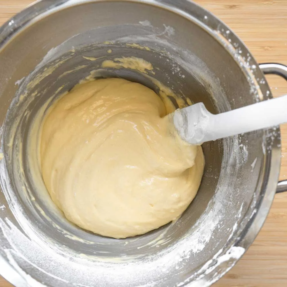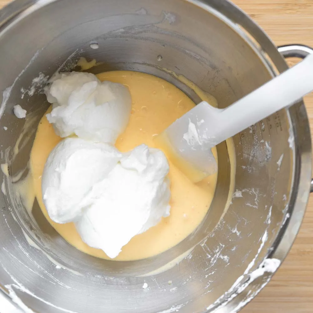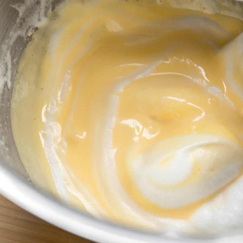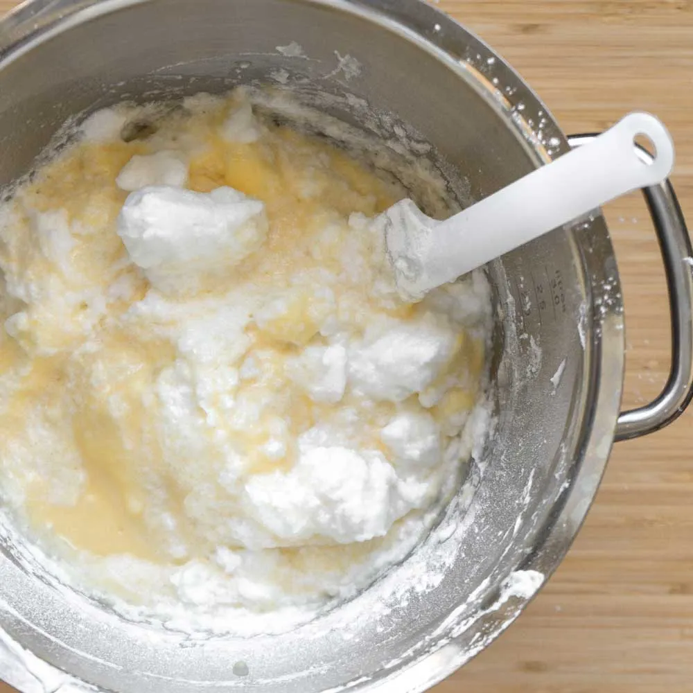 Вводим треть белков во взбитые желтки, и аккуратно перемешиваем лопаткой. Движения снизу вверх, поворачивая чашу. Сейчас мы облегчили желтки, и дальше масса не осядет так сильно. Если сейчас ты понимаешь, что белки перевзбиты, то лучше остаток выкинуть, и взбить с нуля еще 3 белка — чтобы не переводить оставшиеся продукты.