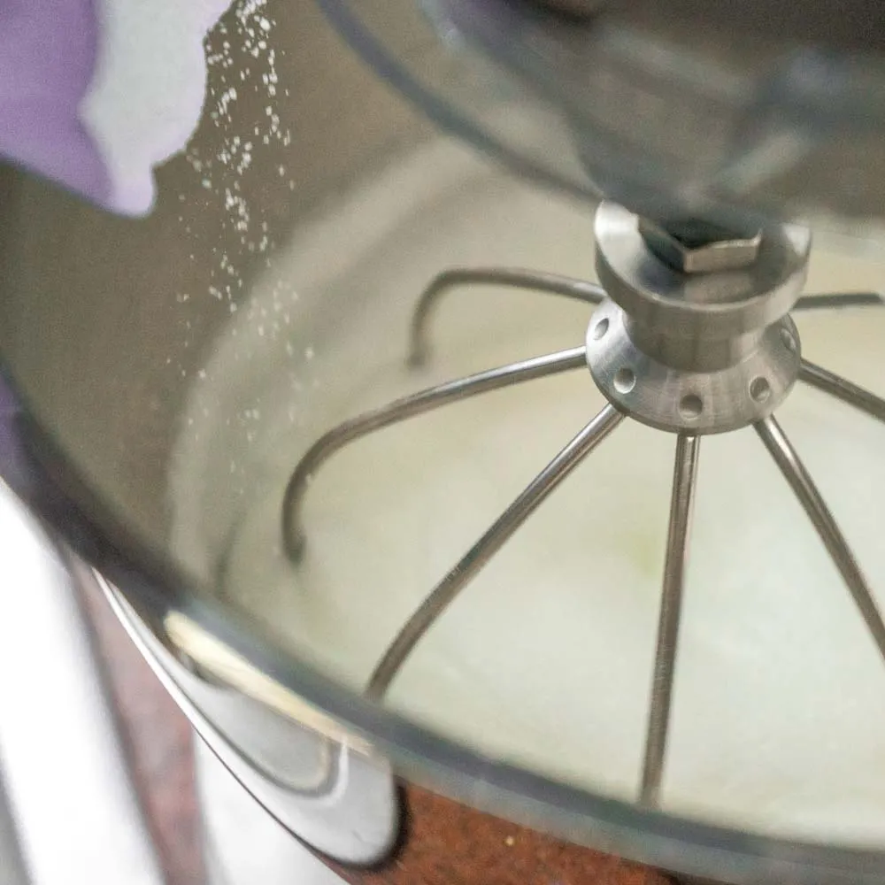 В книге предлагается сразу взбивать их с сахаром на средне-высокой скорости в течение 9-10 минут, но в таком темпе моя машинка все время их перевзбивает, и получается трэш… так что я делаю по-другому.