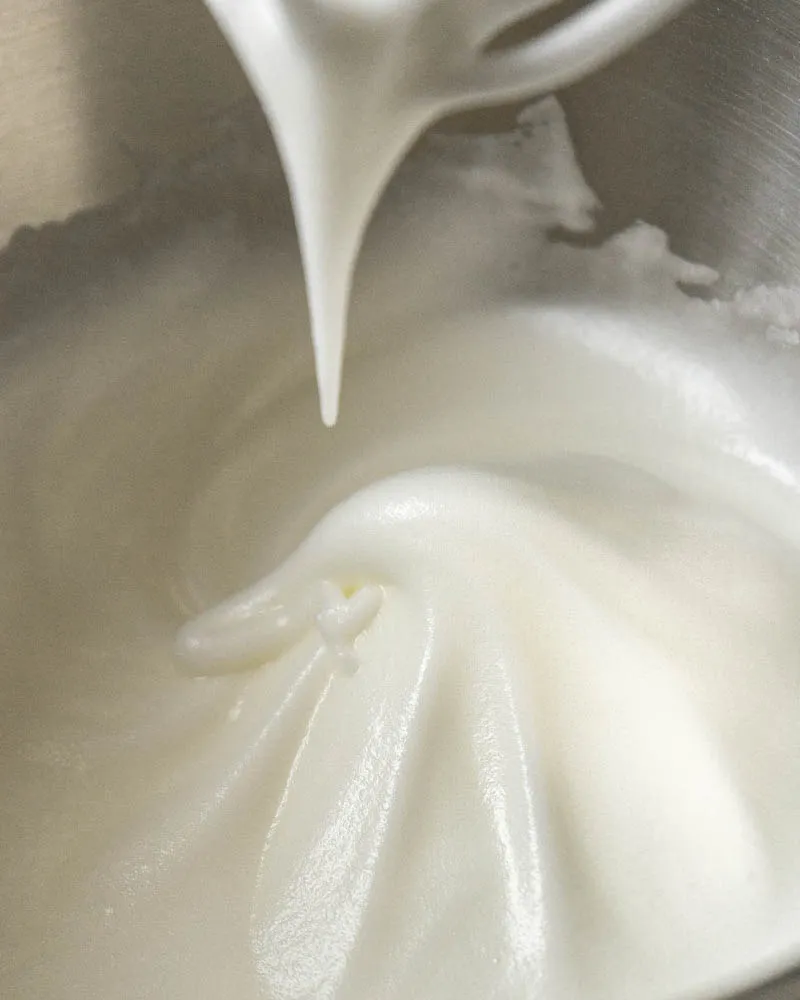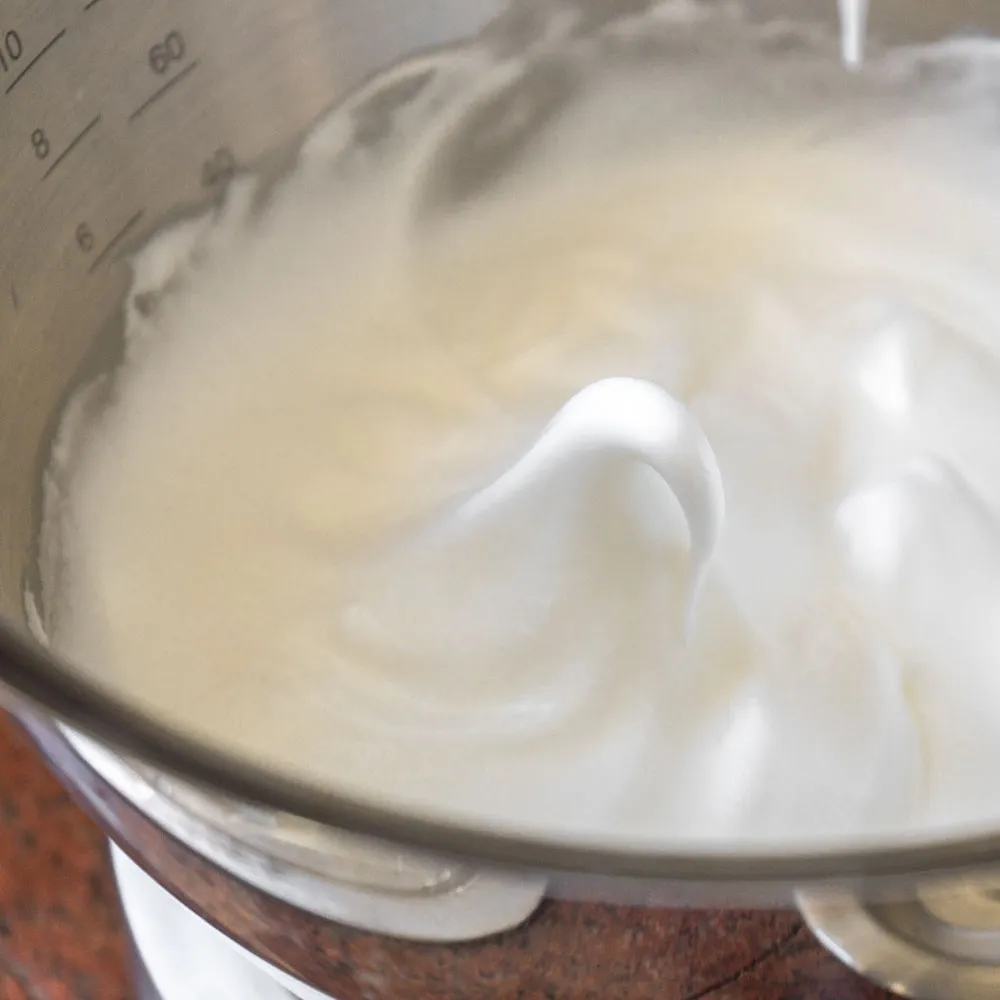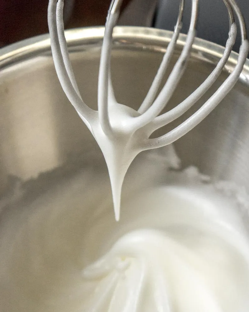Не прекращая взбивать, дождиком всыпаем часть сахара (70 гр.), и взбиваем еще минуты 3 — до растворения сахара, и образования мягких пиков. Меренга гладкая, блестящая, почти не держится на венчике, и стекает лентой.