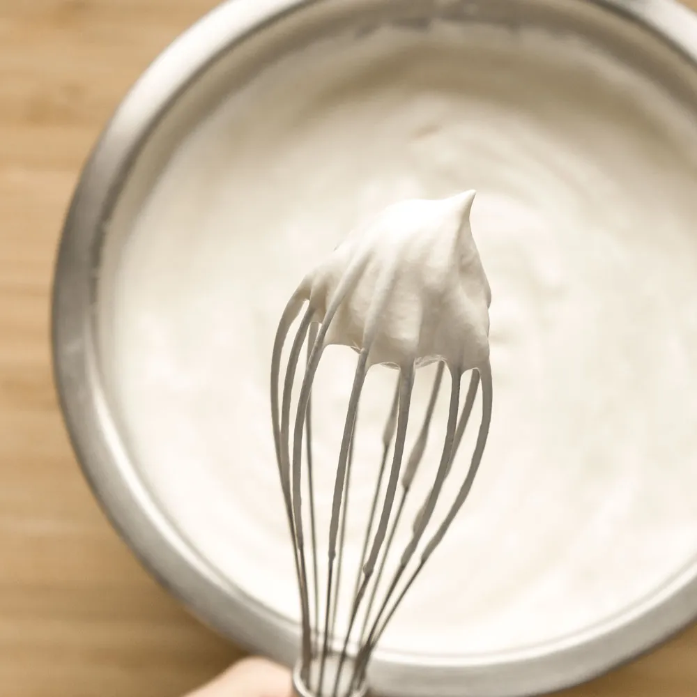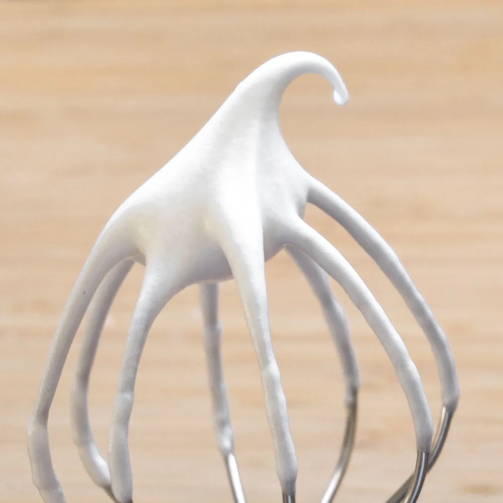 Край, до какого состояния можно взбивать белки на бисквит — это средние пики — масса уже держится на венчике, но клювик загибается.