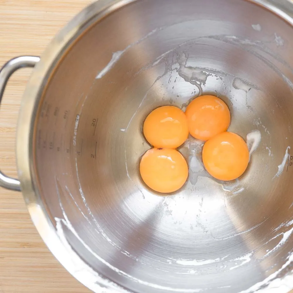 От сахара желтки начинают «гореть» — появляются желтые комочки, которые ни чем не разобьешь, поэтому мы сначала начинаем взбивать, и лишь потом всыпаем сахар.