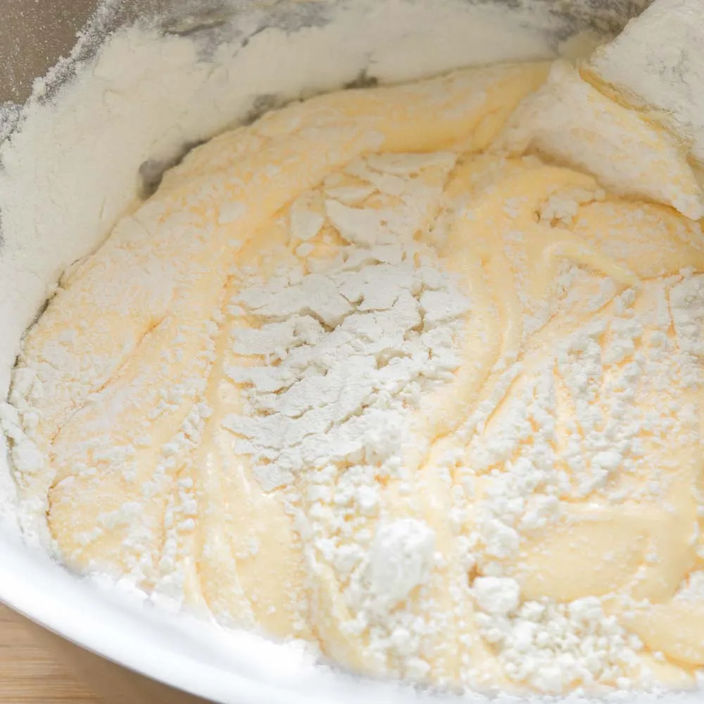Просеиваем мучную смесь в дежу. Перемешиваем так же сверху-вниз. За счет того, что мы ввели белки, тесто все еще воздушное.