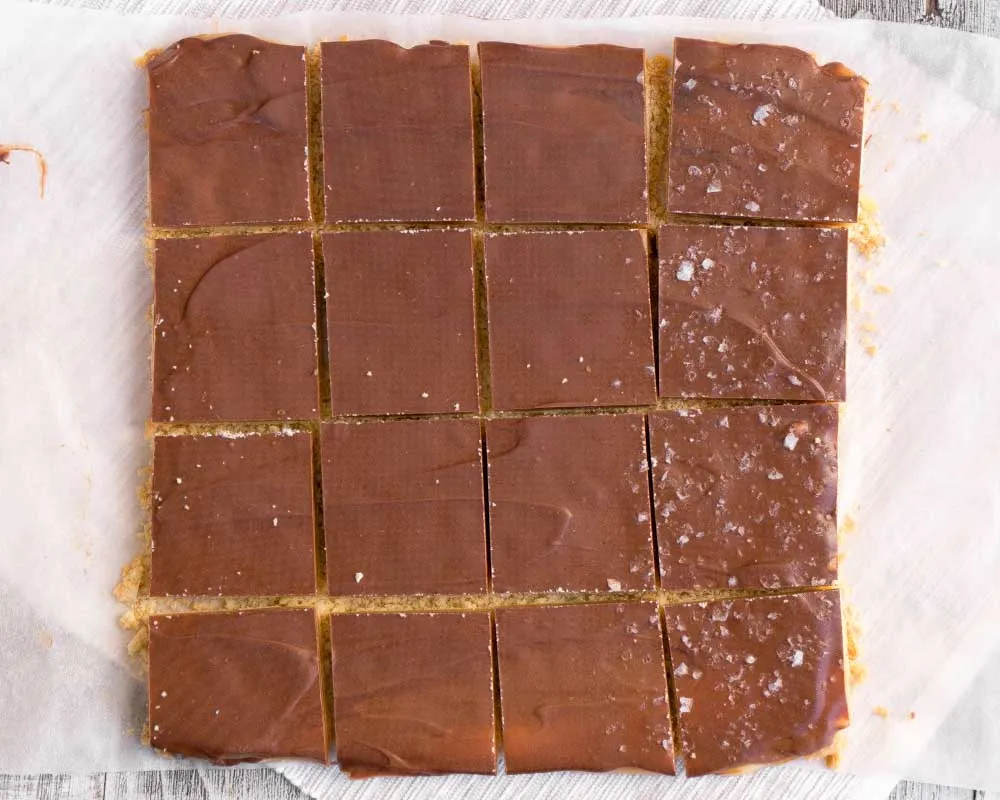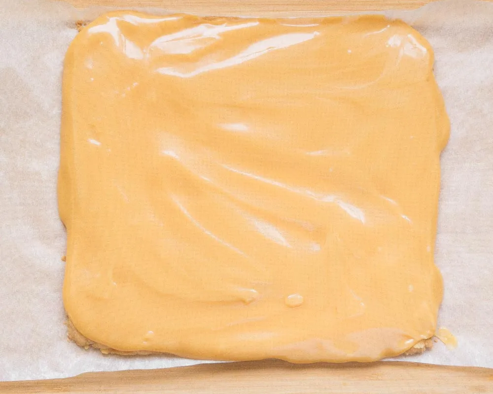 Шоколад начинает таять от 30°С, и если делаешь все сразу, он легко растает. Но если хочешь сделать все по правилам — охлаждай печеньку с карамелью (идеально — 18°С), отдельно топи и темперируй шоколад, и заливай. Слой шоколада можно сделать потолще. При желании можно сверху посыпать крупной солю.