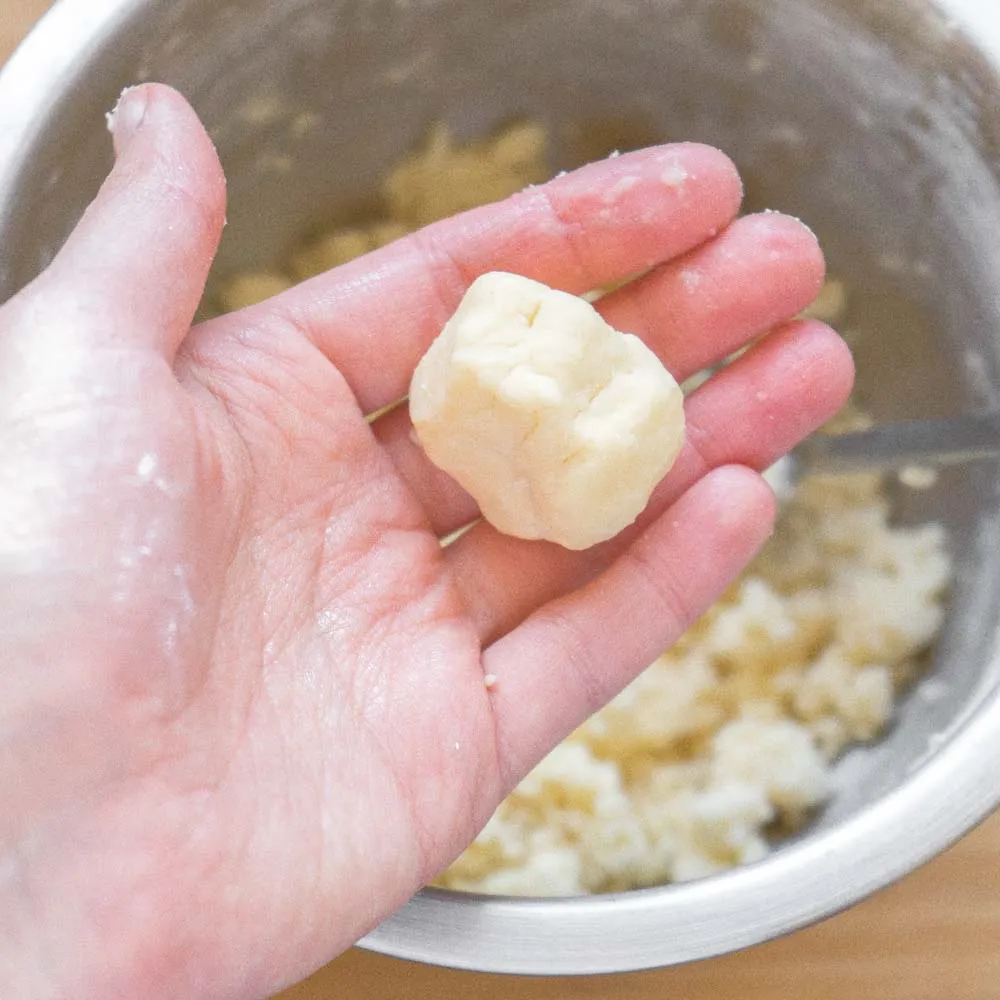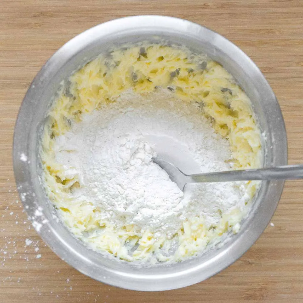 В миску просеиваем муку (125 гр.), разрыхлитель (0,5 ч.л.) и добавляем кукурузный крахмал (20 гр). Отдельно взбиваем сливочное масло (85 гр.) и сахарную пудру (30 гр.) до однородного воздушного состояния.