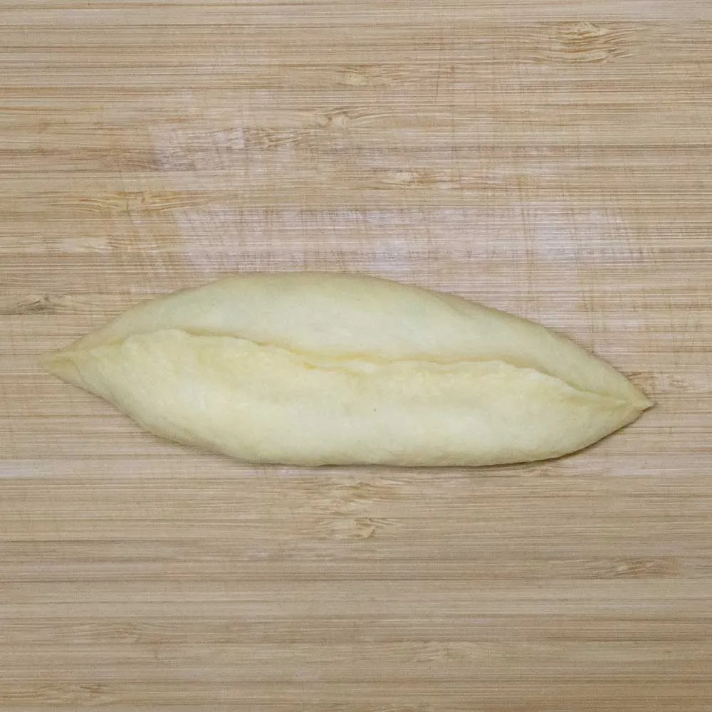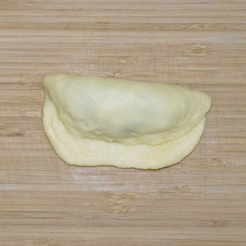 Для стандартных круглых лодочек лучше также залепить и спрятать шов — один из вариантов — сделать его внахлест — оборачиваем начинку тестом, и защипываем пирожок, оставляя еще 1 см для нахлеста.
