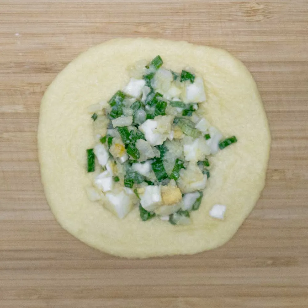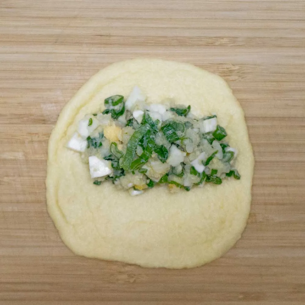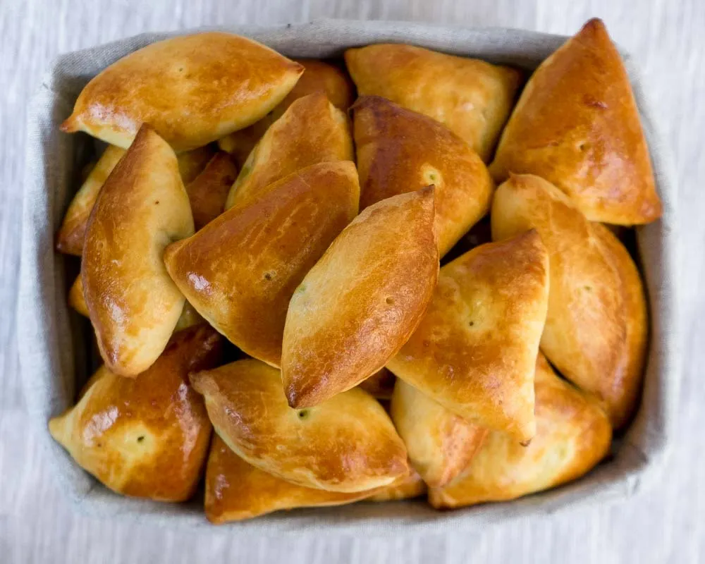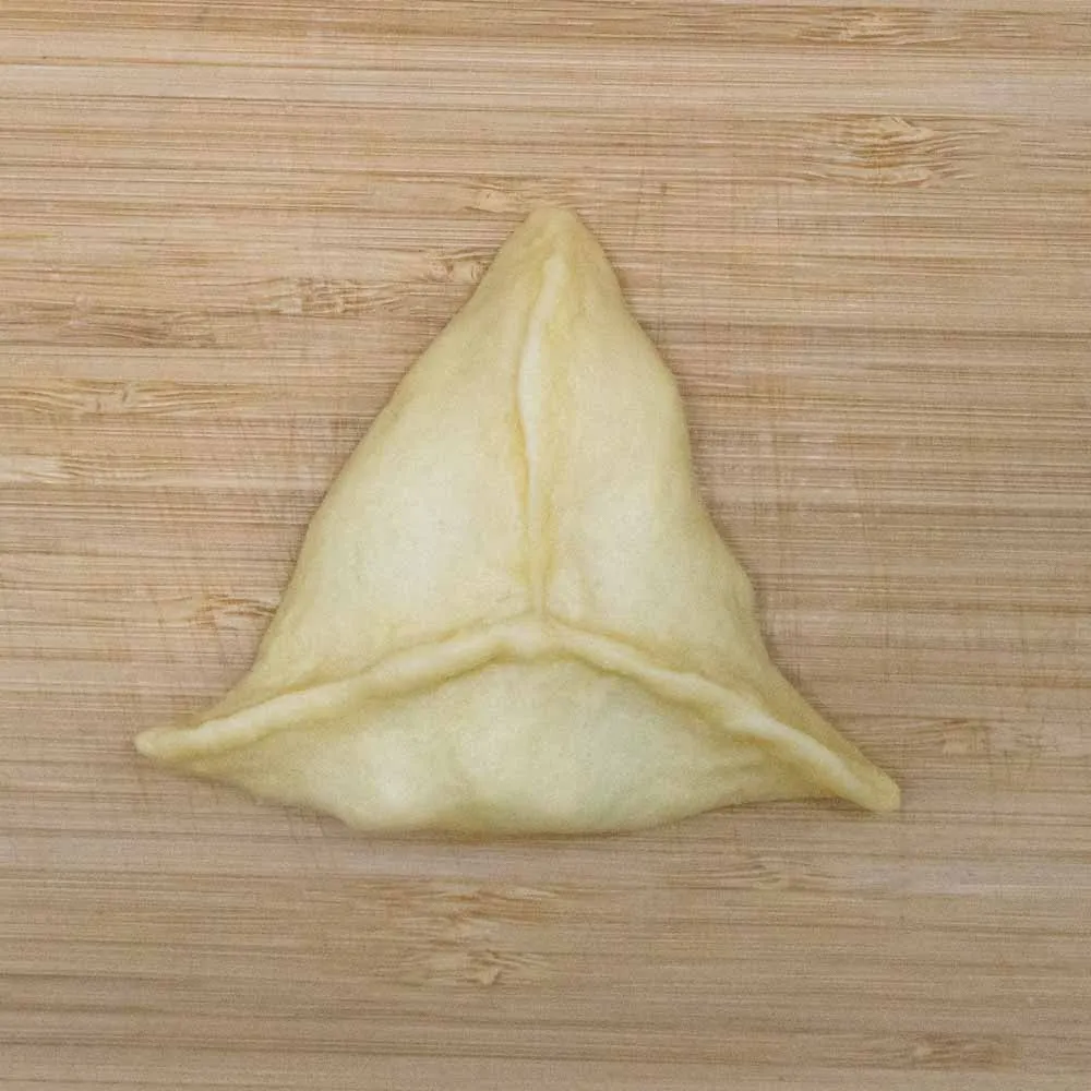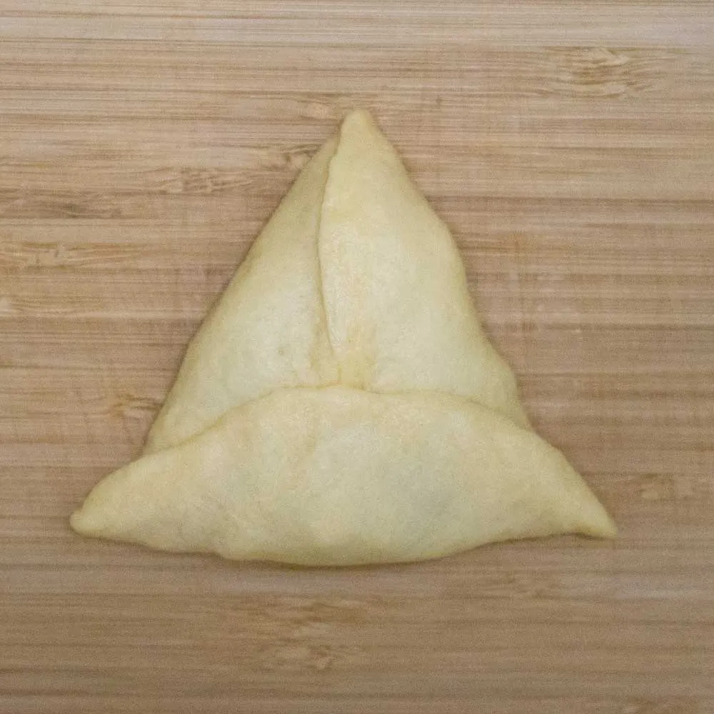 Для формы треугольника сначала раскатываем лепешку, добавляем начинку. Одну сторону защипываем сверху до середины. Две других — подгибая тесто снизу.