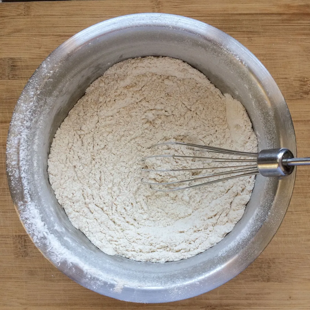 В одну миску наливаем кефир (400 гр), добавляем соль (6 гр, 1 ч.л. без горки), сахар (6 гр, 1 ч.л. с горкой), размешиваем ложкой. В другую миску просеиваем муку (200 гр. обычной и 200 гр. цельнозерновой, или 400 гр. обычной). Туда же просеиваем соду (5 гр, 0.5 ч.л. без горки), смешиваем венчиком, чтобы она равномерно распределилась по всему объему муки.