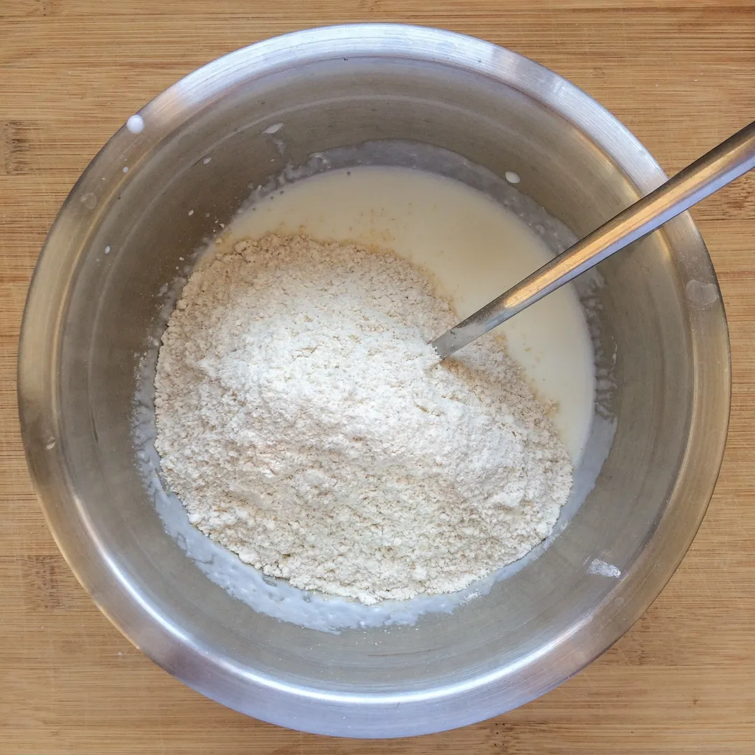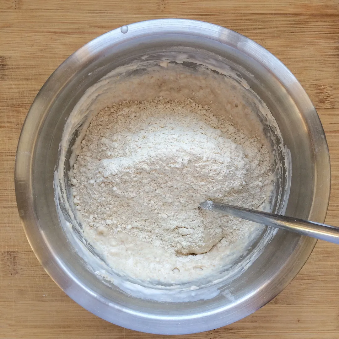 По частям вводим муку в кефир. Сначала 300 грамм, потом еще 50, и остаток. Перемешиваем ложкой. Вводим частями на случай, если твоя мука поглощает больше влаги, чем моя, чтобы тесто не получилось каменным булыжником. Вполне возможно, что тебе понадобится меньше муки, особенно если печешь на хлебной.