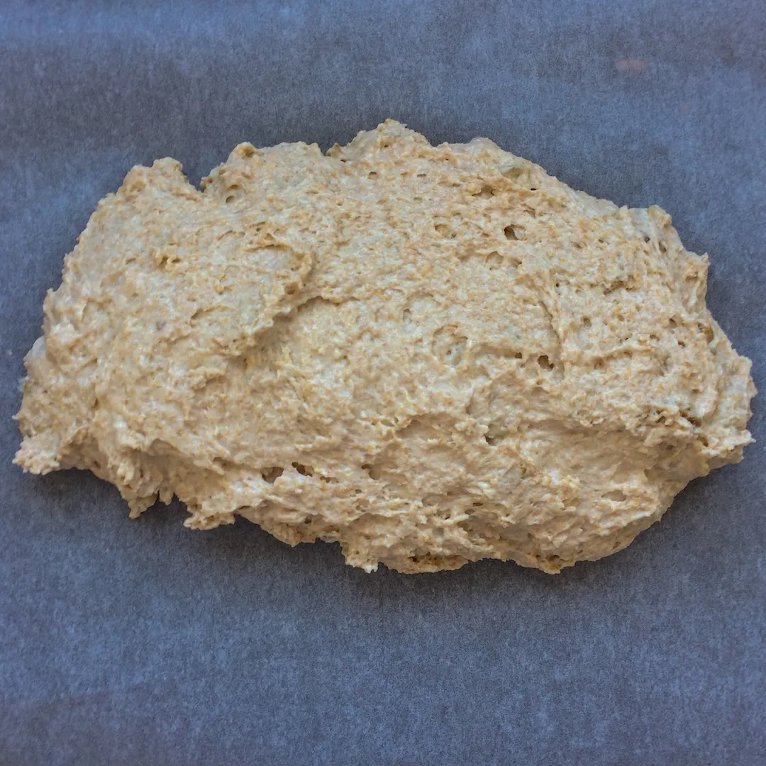 Тесто должно получится густое, не растекаться, но все еще липнуть к рукам, и его можно вымесить большой ложкой — она не гнется и не ломается.