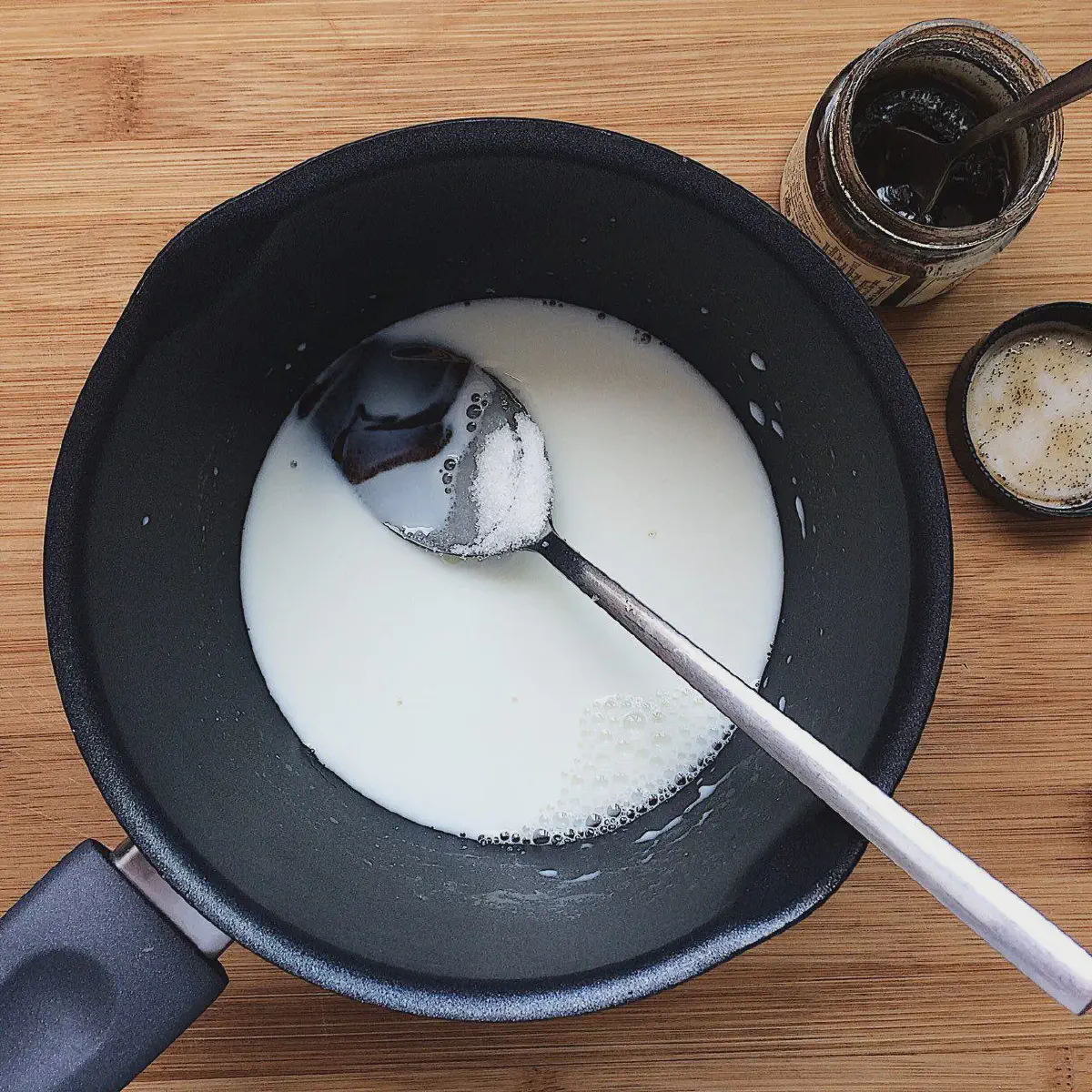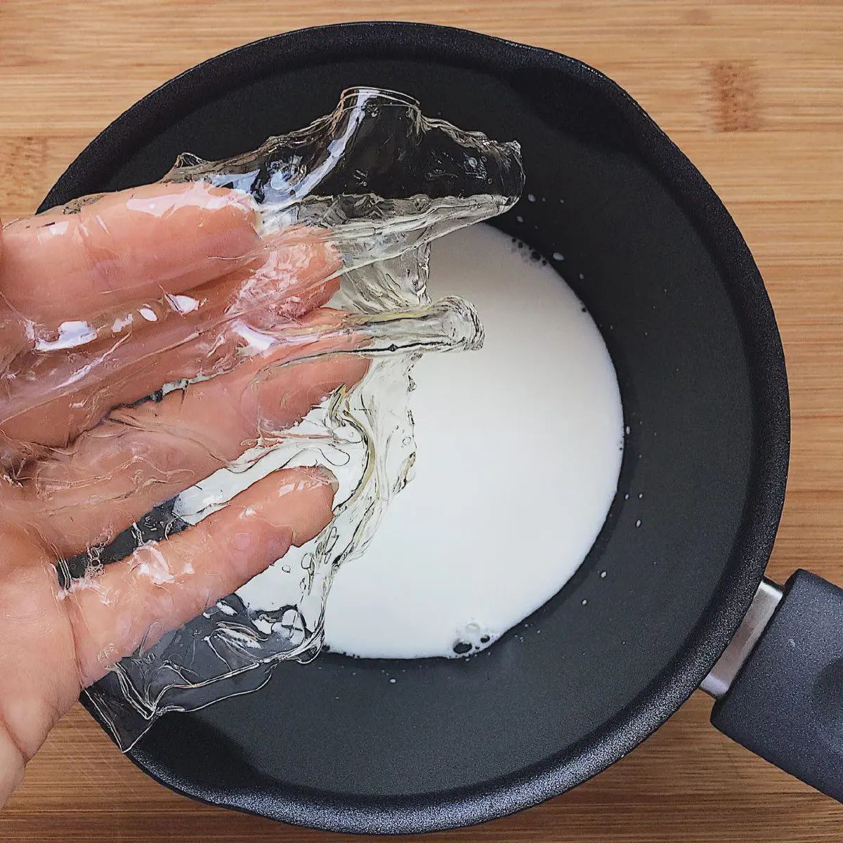 Хорошенько перемешиваем — растворяем желатин в молоке. Если остаются комочки — чуть-чуть подогрейте жидкость.